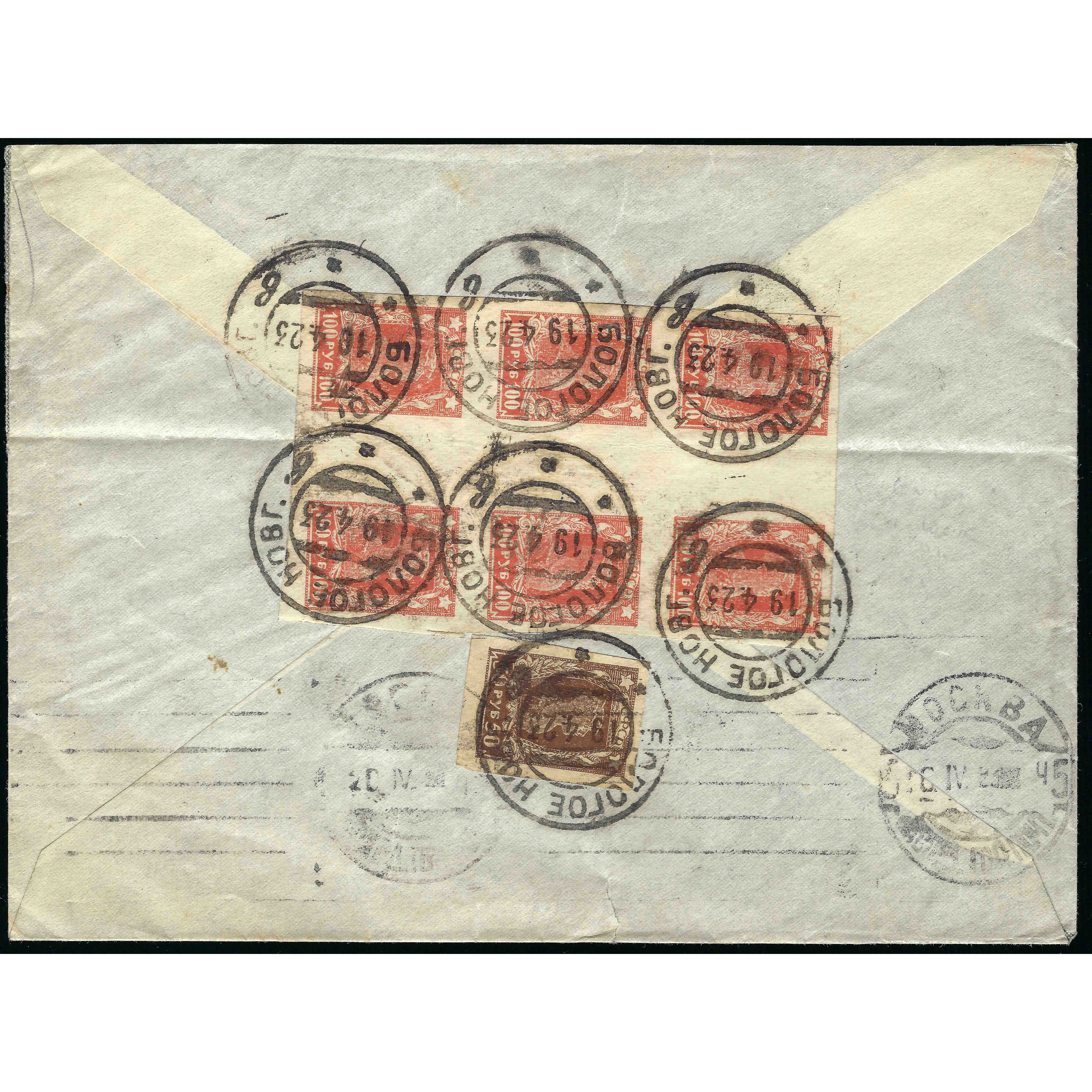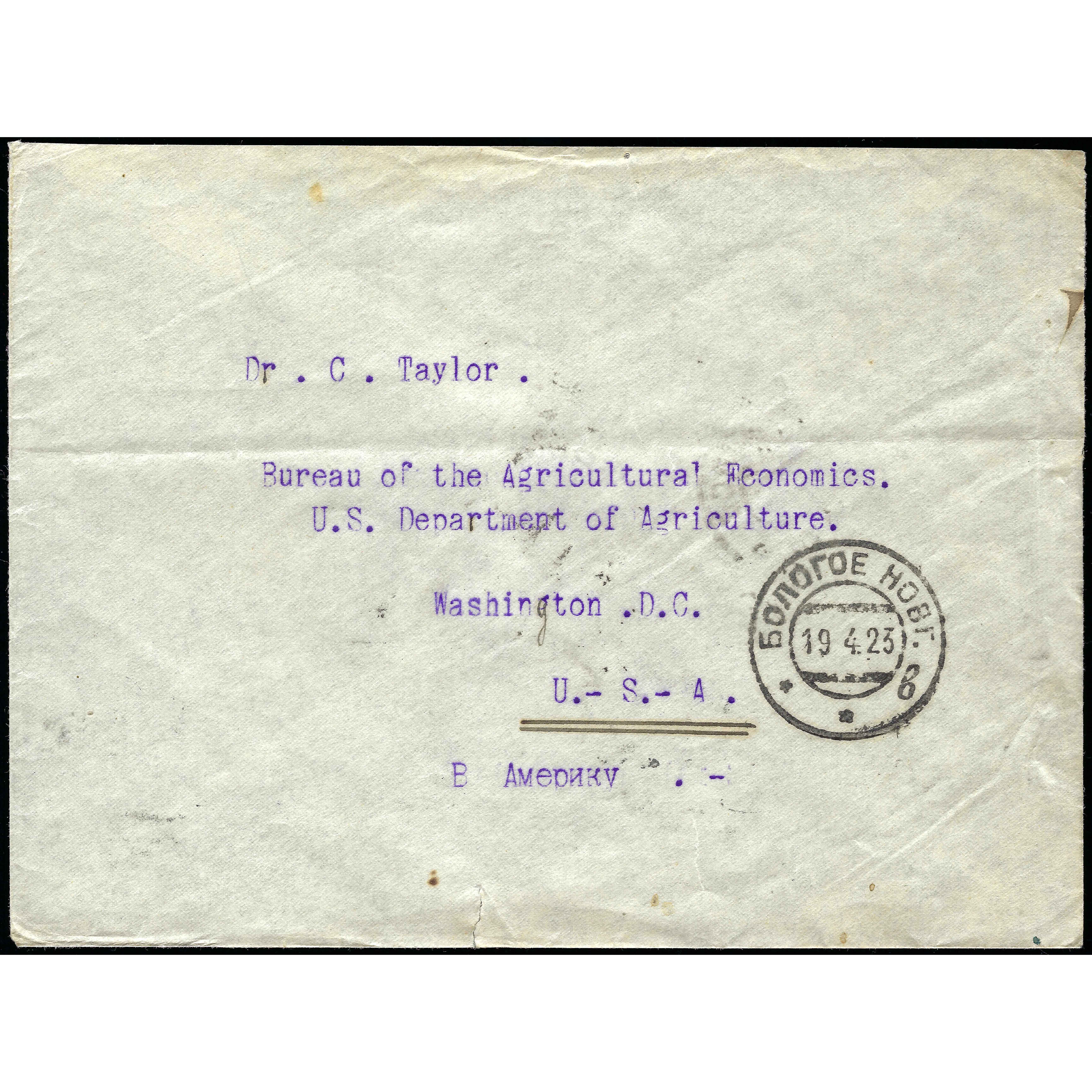 April 19, 1923. Letter sent from Bologoye to the USA. Addressed to: Mr. H. C. Taylor, Bureau of Agricultural Economics, U.S. Department of Agriculture, Washington. The reverse side of the letter shows that it was transported via the Moscow – Leningrad (Petrograd) railway. The letter is addressed to Washington, D.C., USA. Franking: The letter is paid with 6 stamps of 100 rubles (= 6 rubles) + 50 kopecks = 6.50 rubles. This corresponded to the tariff for a standard letter.