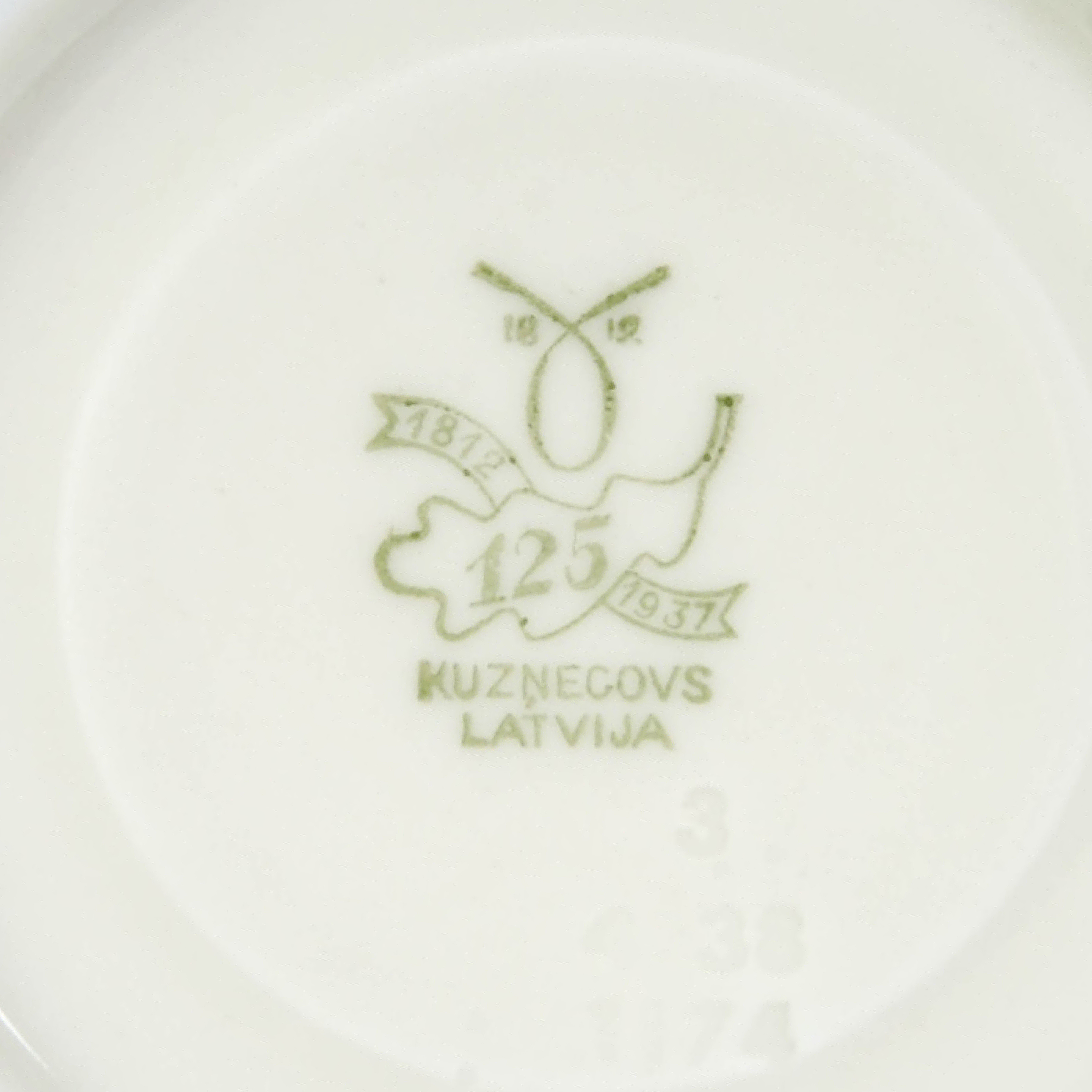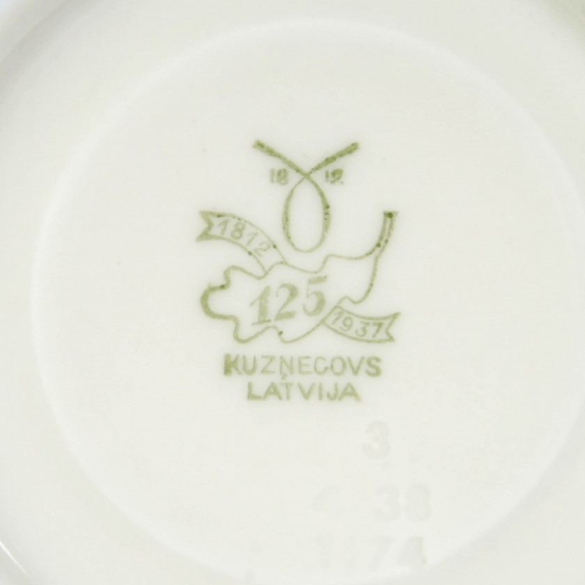 Kuznetsov Porcelain Factory in Riga was founded in 1841, but official establishment date of the company in Russia was considered in 1812, when Kuznetsov established his first company in Gzhel (Гжель) near Moscow. At Riga`s factory produced halffaience, but from 1851 porcelain products. In 1864 after Sidor Kuznetsov death management of the company's was taken over by his son Matvey Kuznetsov. In 1872 Matvey Kuznetsov changed company name to M. S. Kuznetsov company. Raw materials for the Riga`s factory came from internal provinces of the Russian Empire, as well as from Germany, Holland, France, Scandinavia, coal - from England. Part of the factory product was sold on the local market and in other provinces of the Russian Empire, the rest of the production was exported to England, Holland and other countries.