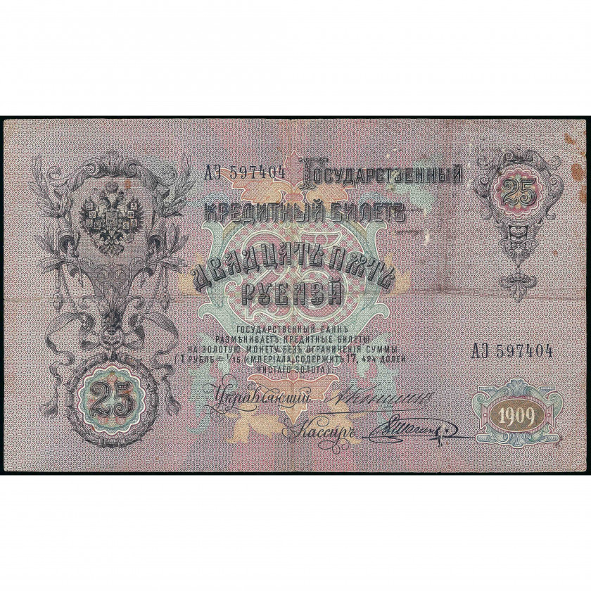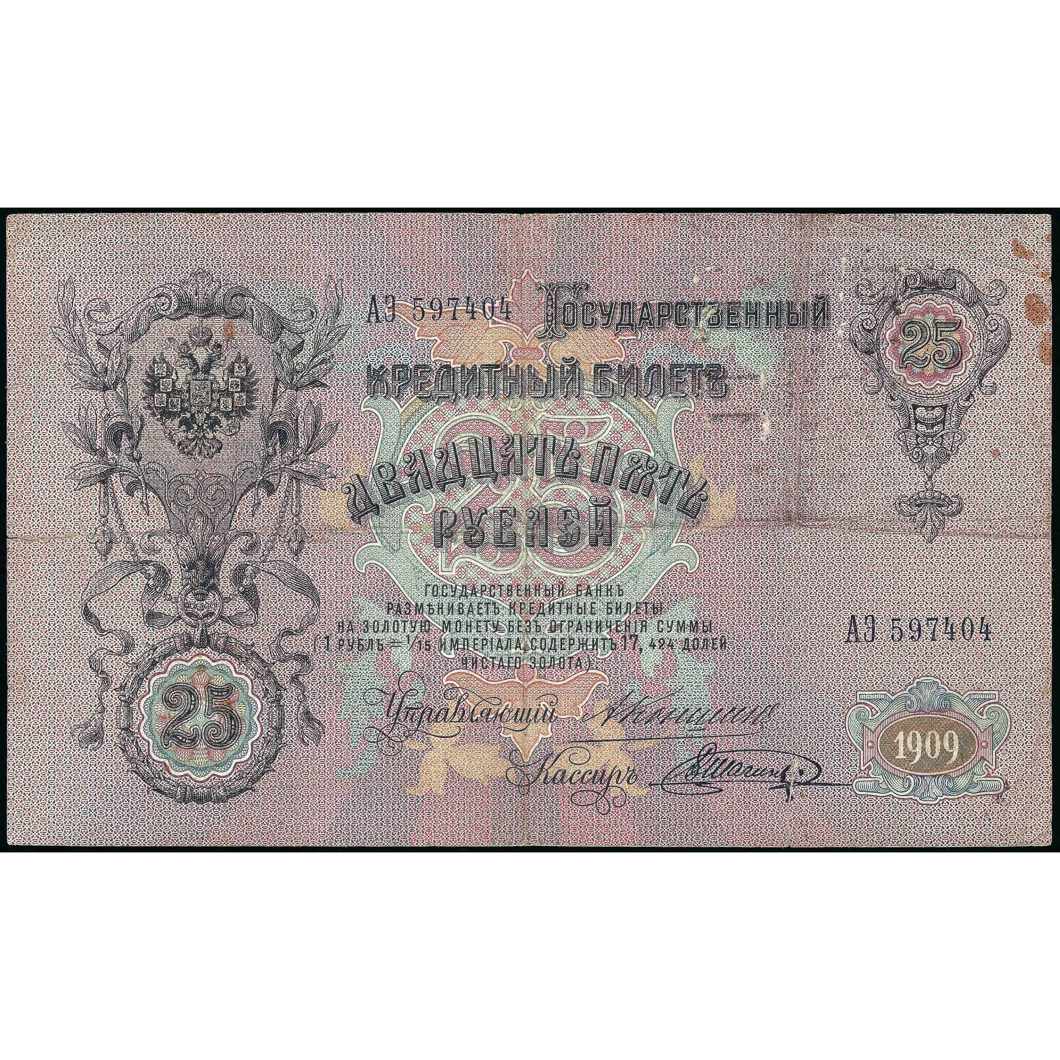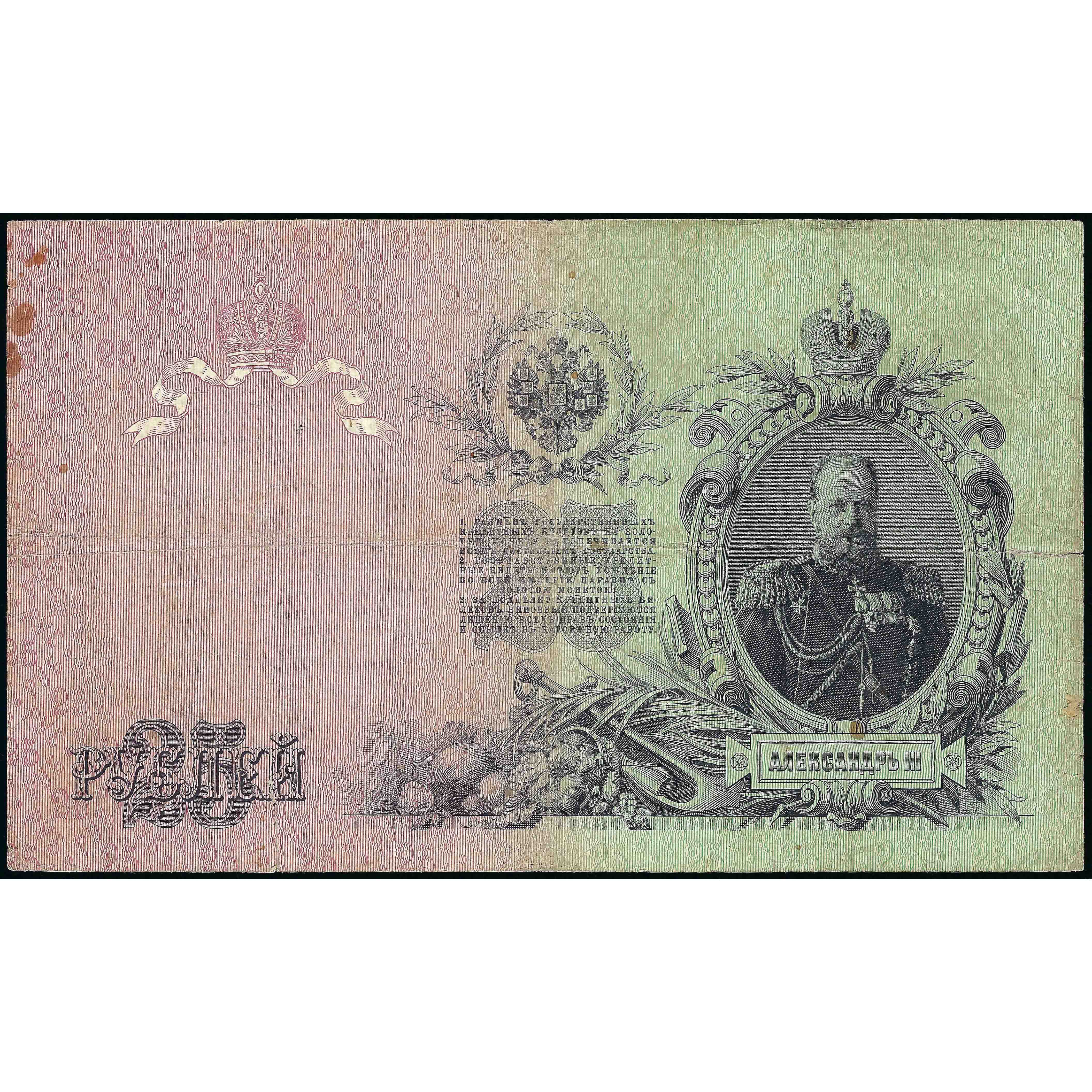 25 rubļi, Krievija, 1909 (1910 - 1914), paraksti A. Konšins / Šagins (VG), Pick 12a