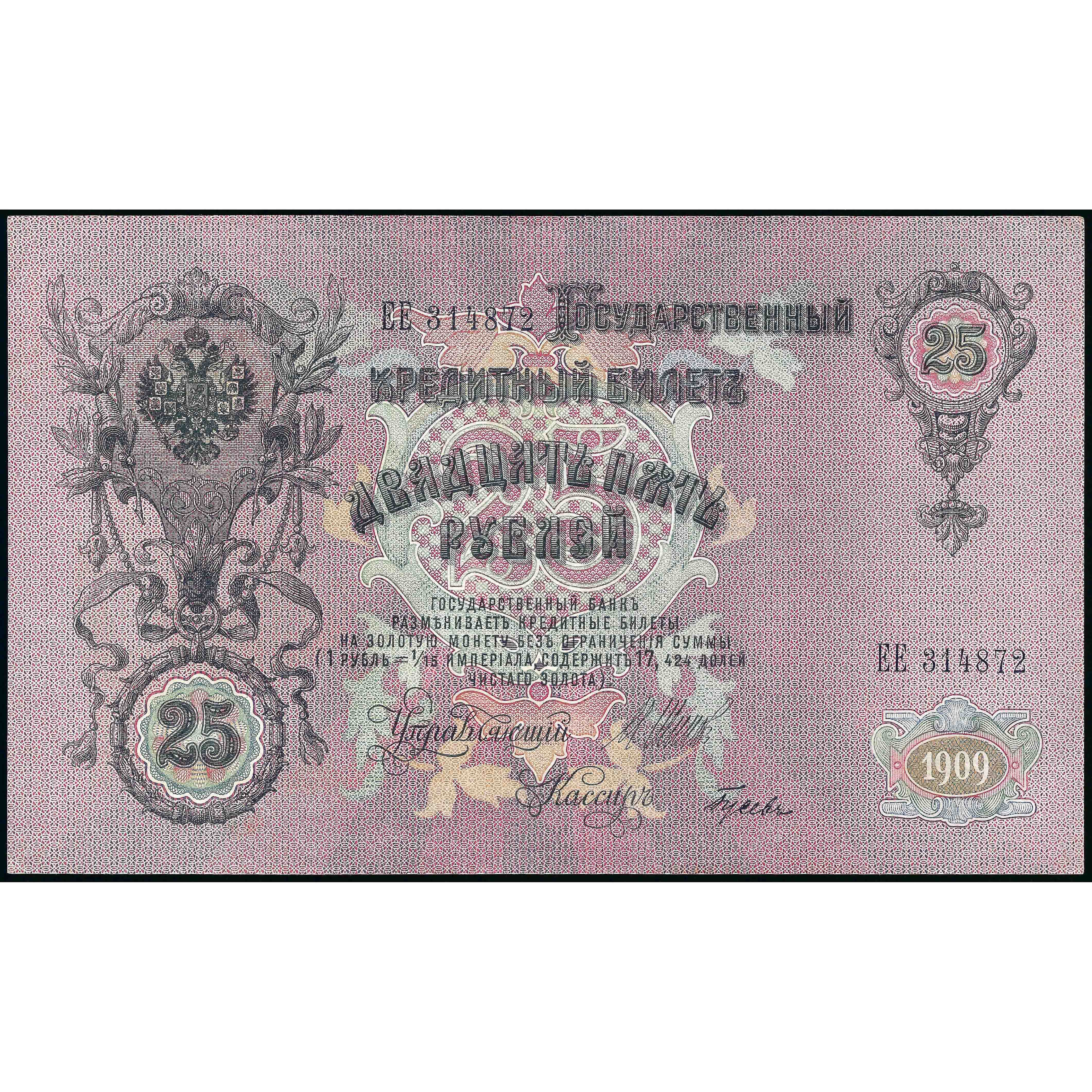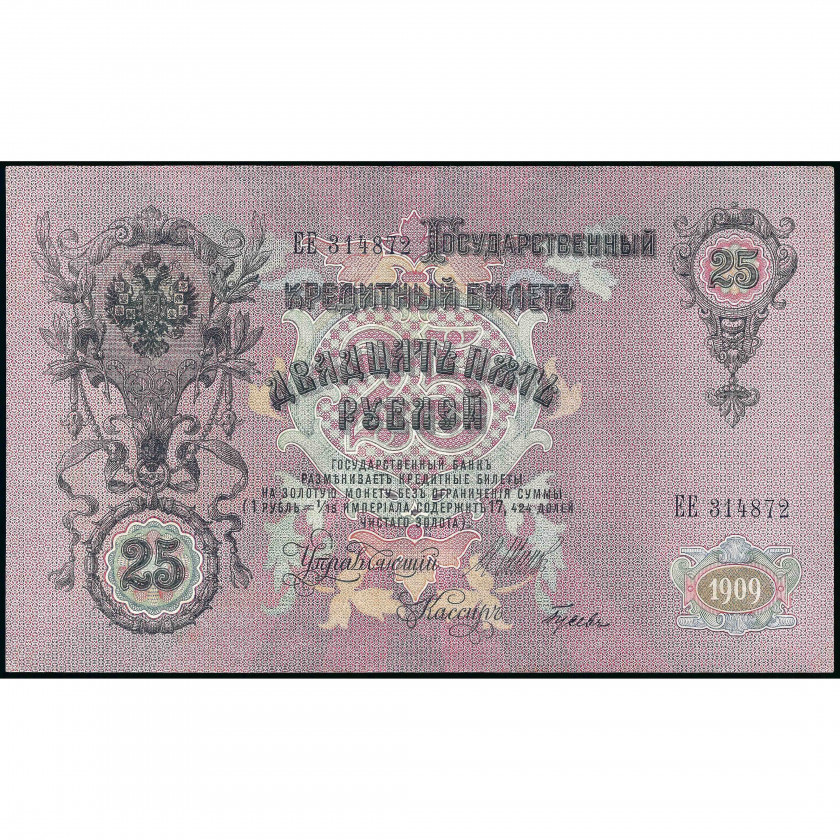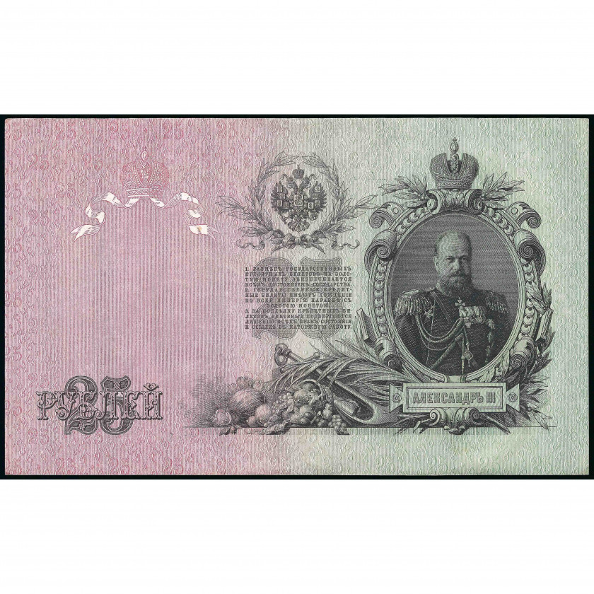 25 рублей, Россия (РСФСР), 1909 г. (1917 - 1921), подписи Шипов / Гусев (AU) Pick 12b