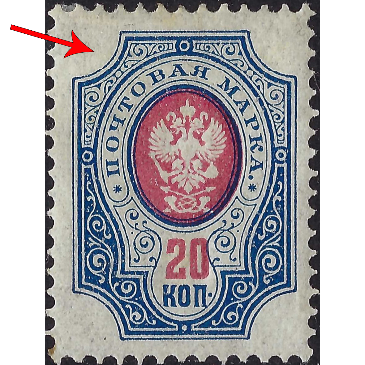 (ERROR) 1908, Russian Empire, 20k, Solovyov #73 / Michel #72A, Typographed, UnWmk, P14:14½