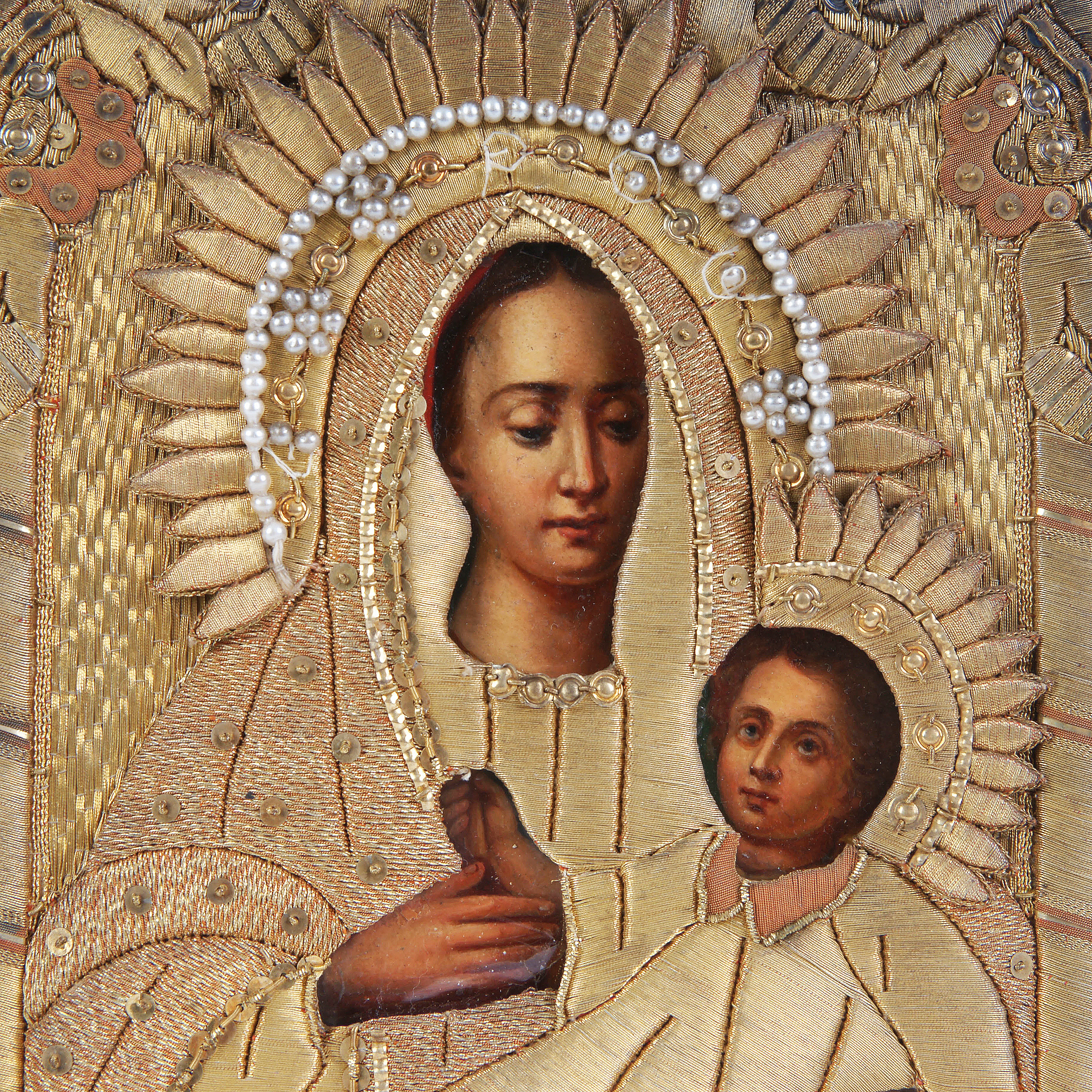 Materials: cloth, freshwater pearl, gesso, gold thread, tempera, wood