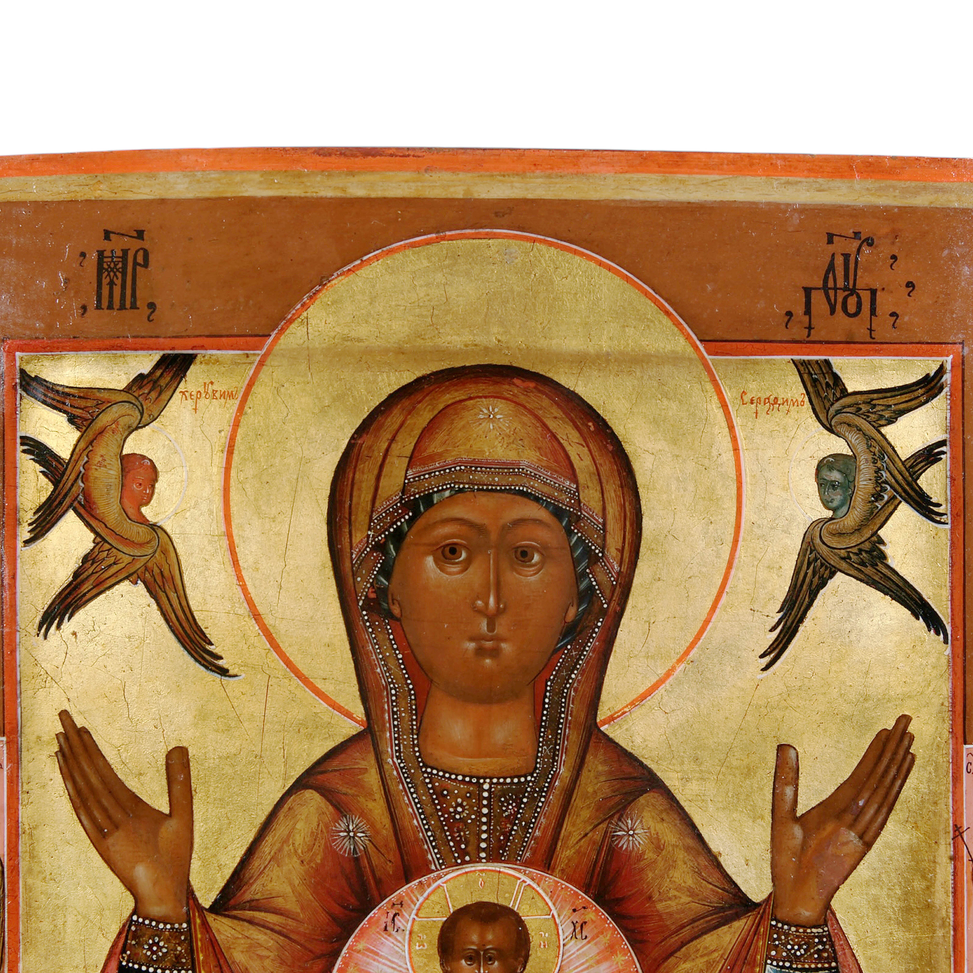 In Russia the icon of Our Lady of the Sign is called "Znamenie". The icon shows Mary, the Mother of God with her arms outstretched in an attitude of prayer. This position of prayer is called Orans and the image of the Mother of God in this position is sometimes called the "Oranta". In her breast is a circular medallion with the Christ child blessing the world. The icon originated in Byzantium and was considered a talisman of the Imperial throne there and in Russia.