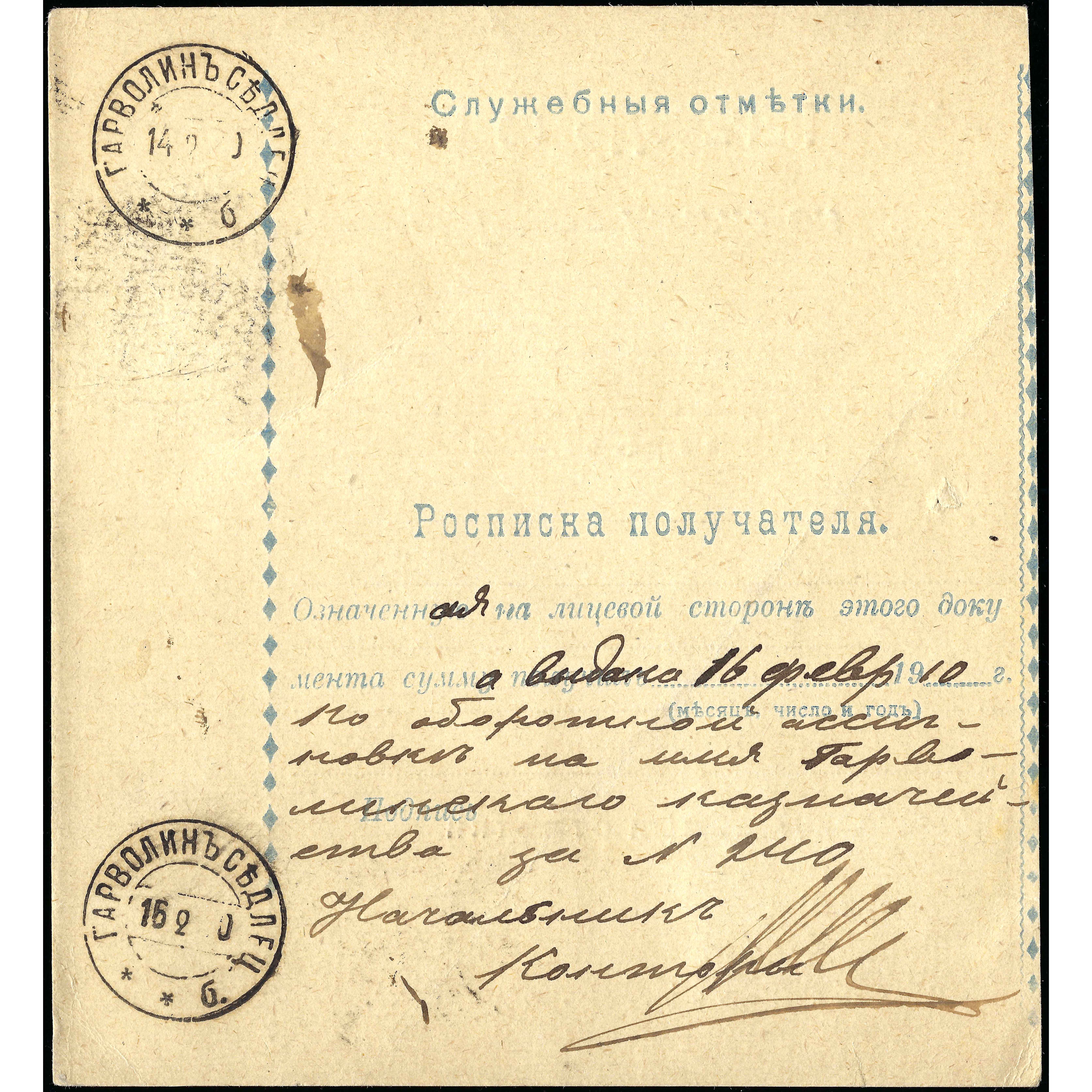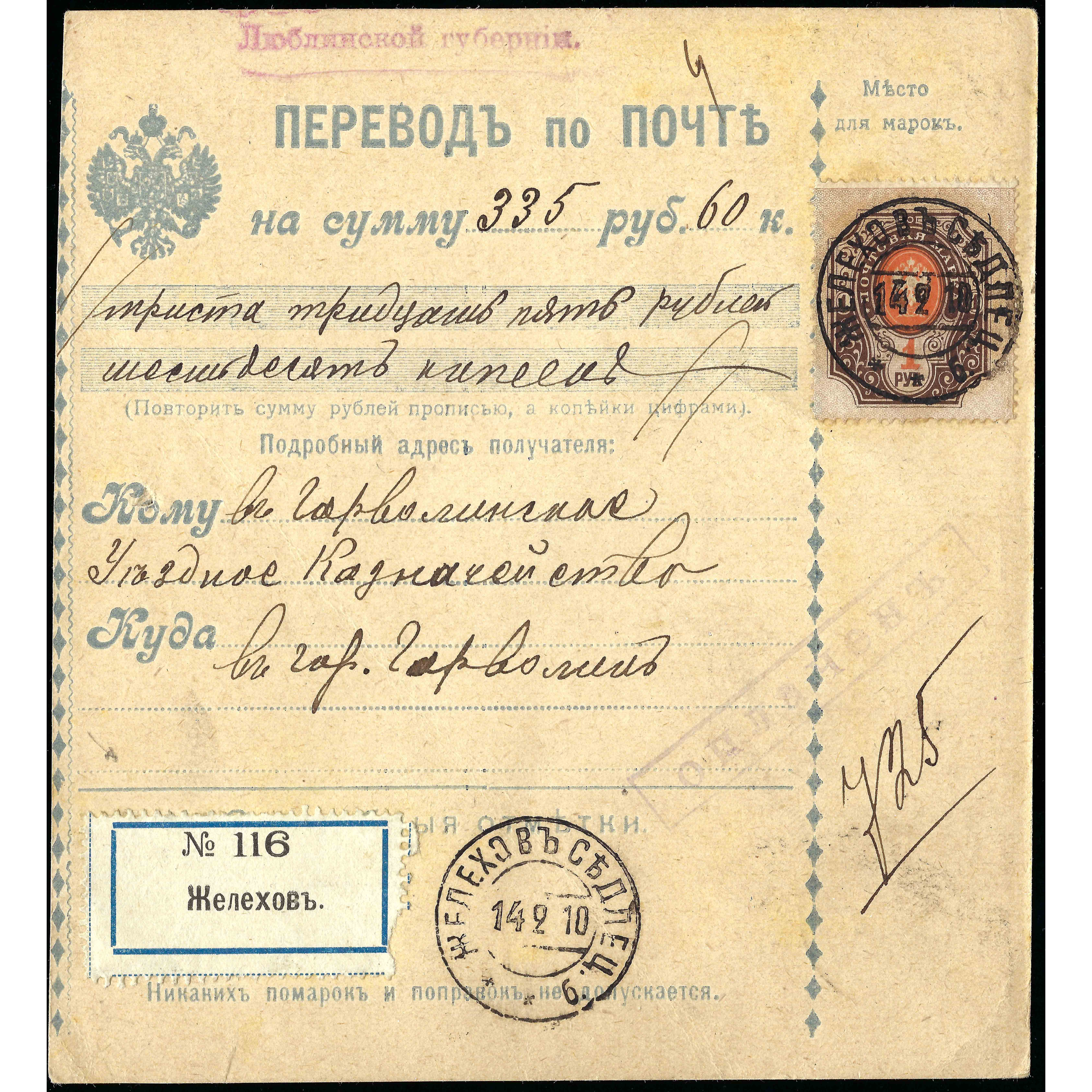 14.02.1910. Vērtības sūtījums (naudas pārvedums), sūtīts no Želehovas (Żelechów) uz Garvolinu (Garwolin) Polijā, I zona. Sūtījums saņemts 16.02.1910., otrā pusē ir saņemšanas kvīts. Naudas pārvedums pareizi apmaksāts ar 1 rubļa marku (perforācija 13 1/4). Pārveduma summa ir 335,60 rubļi, un nodevā iekļauta maksa par ieteiktu (ierakstītu) sūtījumu.