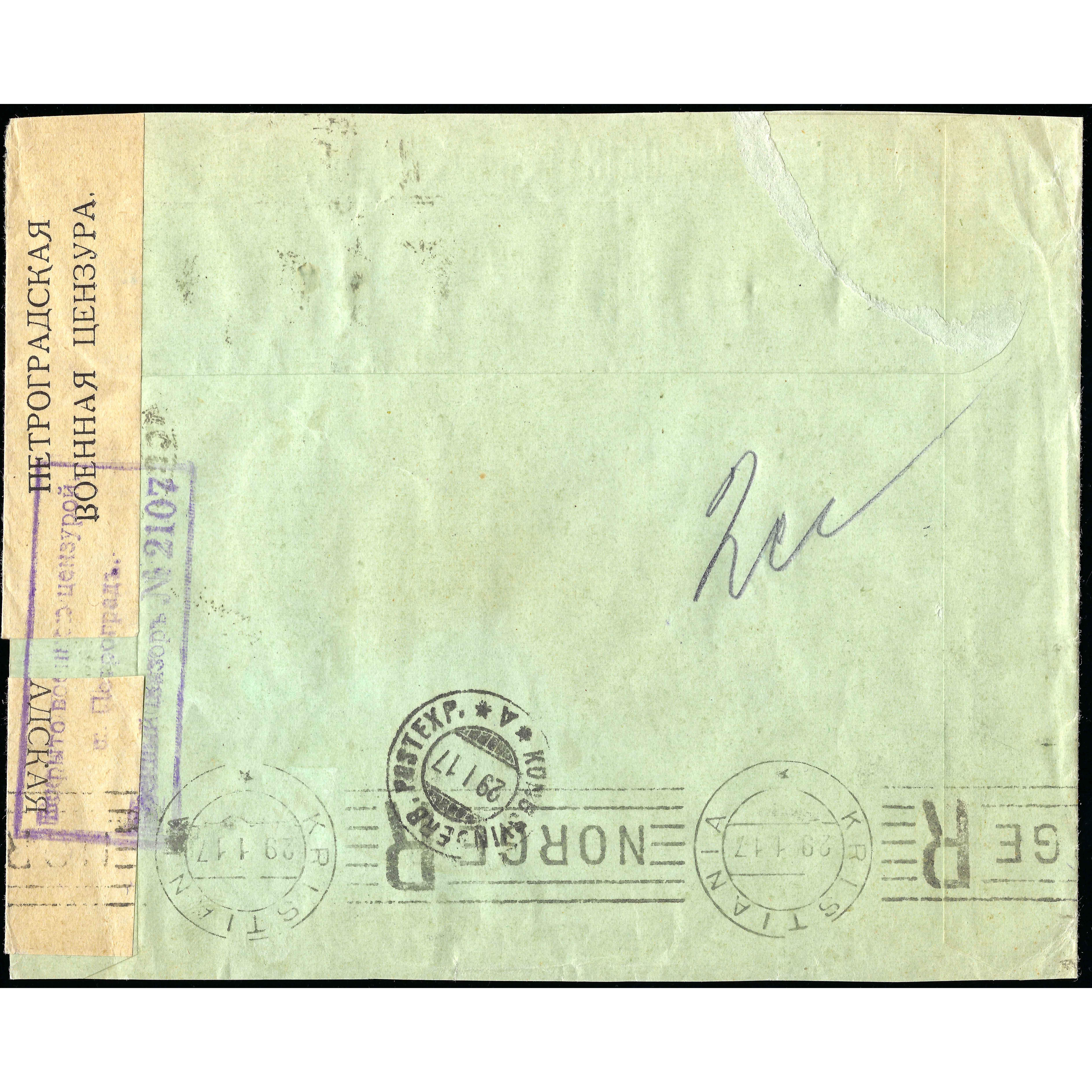 15.12.1916. Ieteikta (ierakstīta) cenzēta vēstule, sūtīta no Petrogradas uz Kristiāniju (Norvēģiju); saņemta tur 29.01.1917. (Gregora / Jūlija kalendārs).