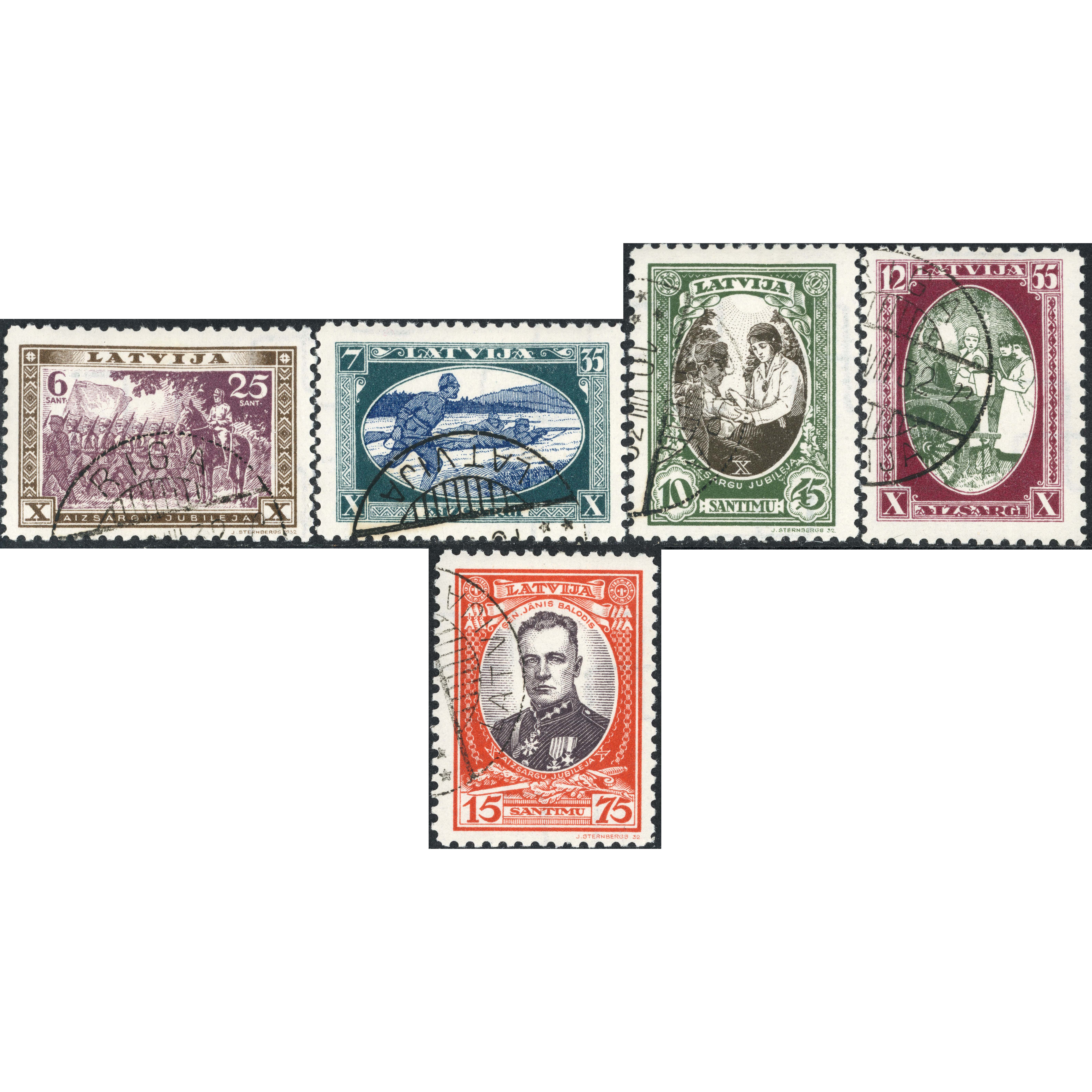 1932, Latvia, 6s-15s, Solovjovs #192-#196 / Michel #198A-#202A, Litogrāfija, Ar zīmogu