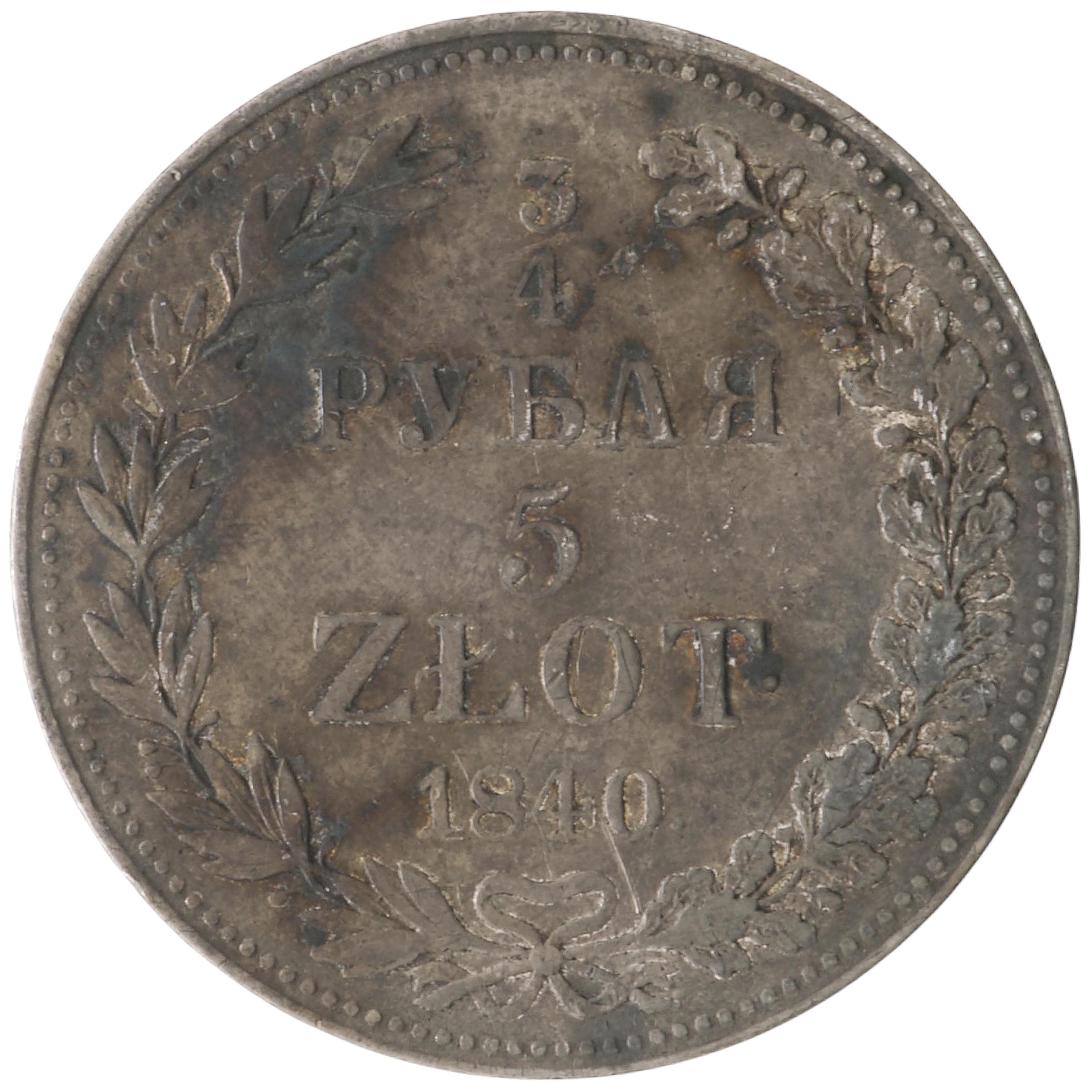 3/4 Rubļi (5 Zloti) 1840 (MW), Polija (Krievijas impērija) (F), KM C# 133