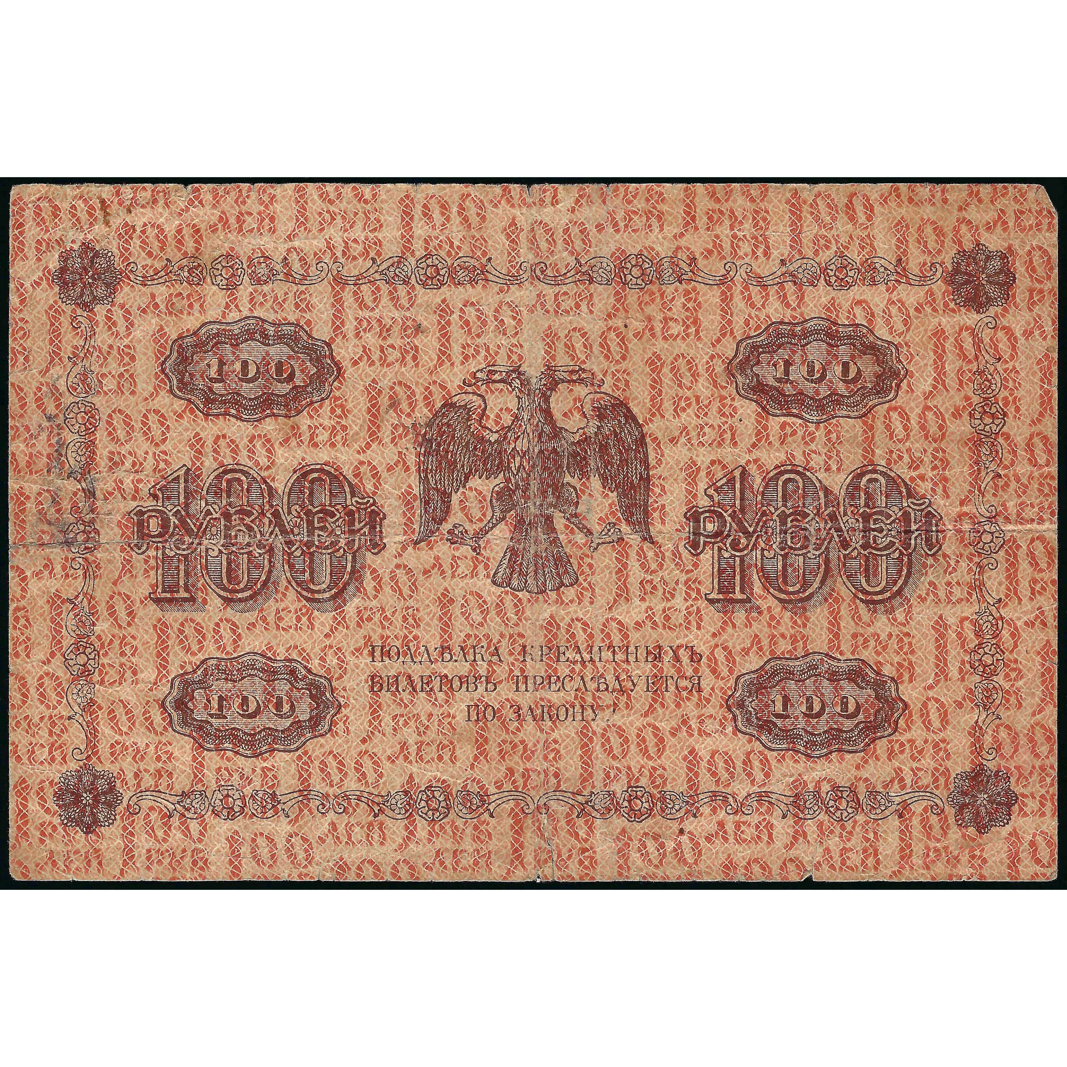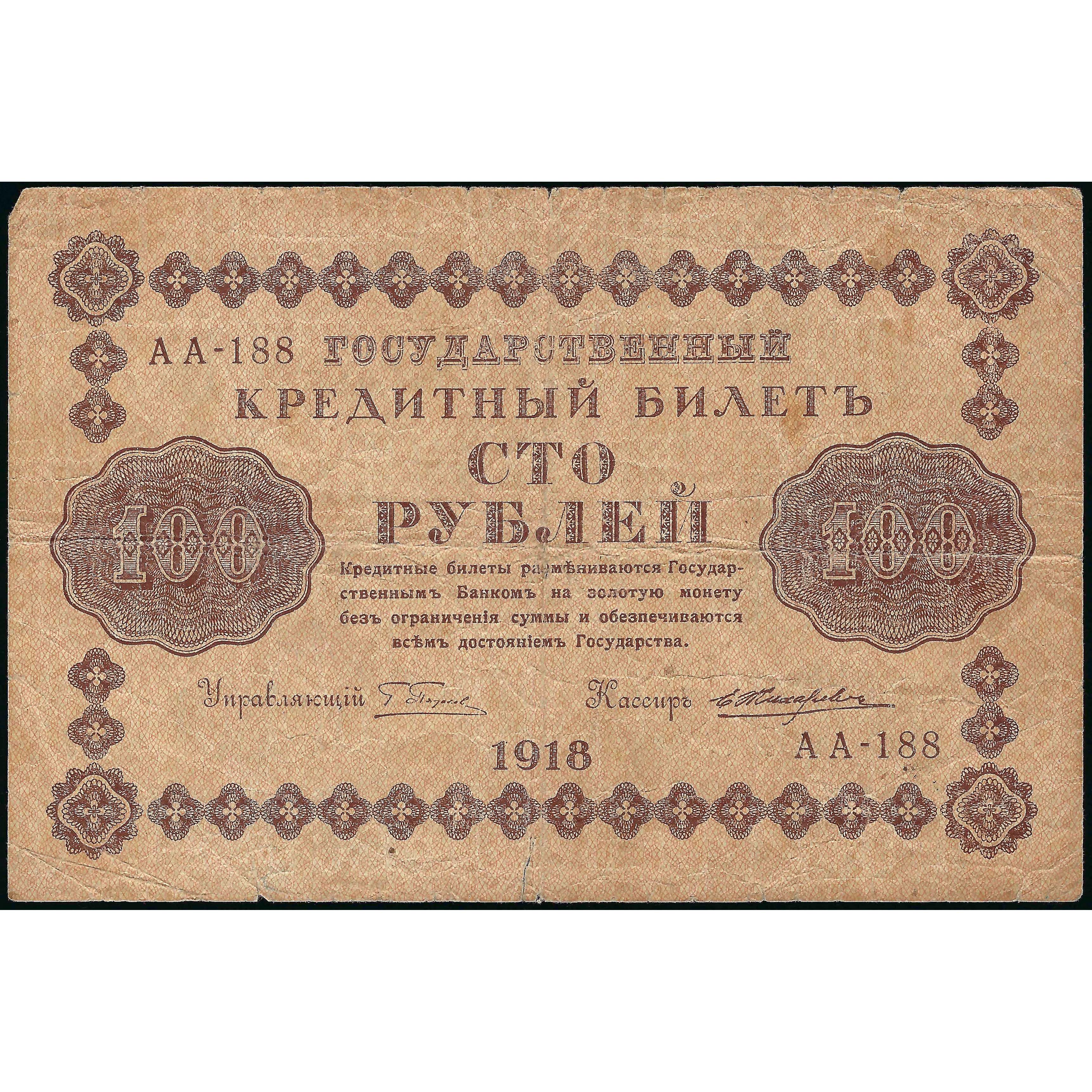100 Рублей, Россия, 1918, подписи Г. Пятаков / Е. Жихарев (VG), Pick 92