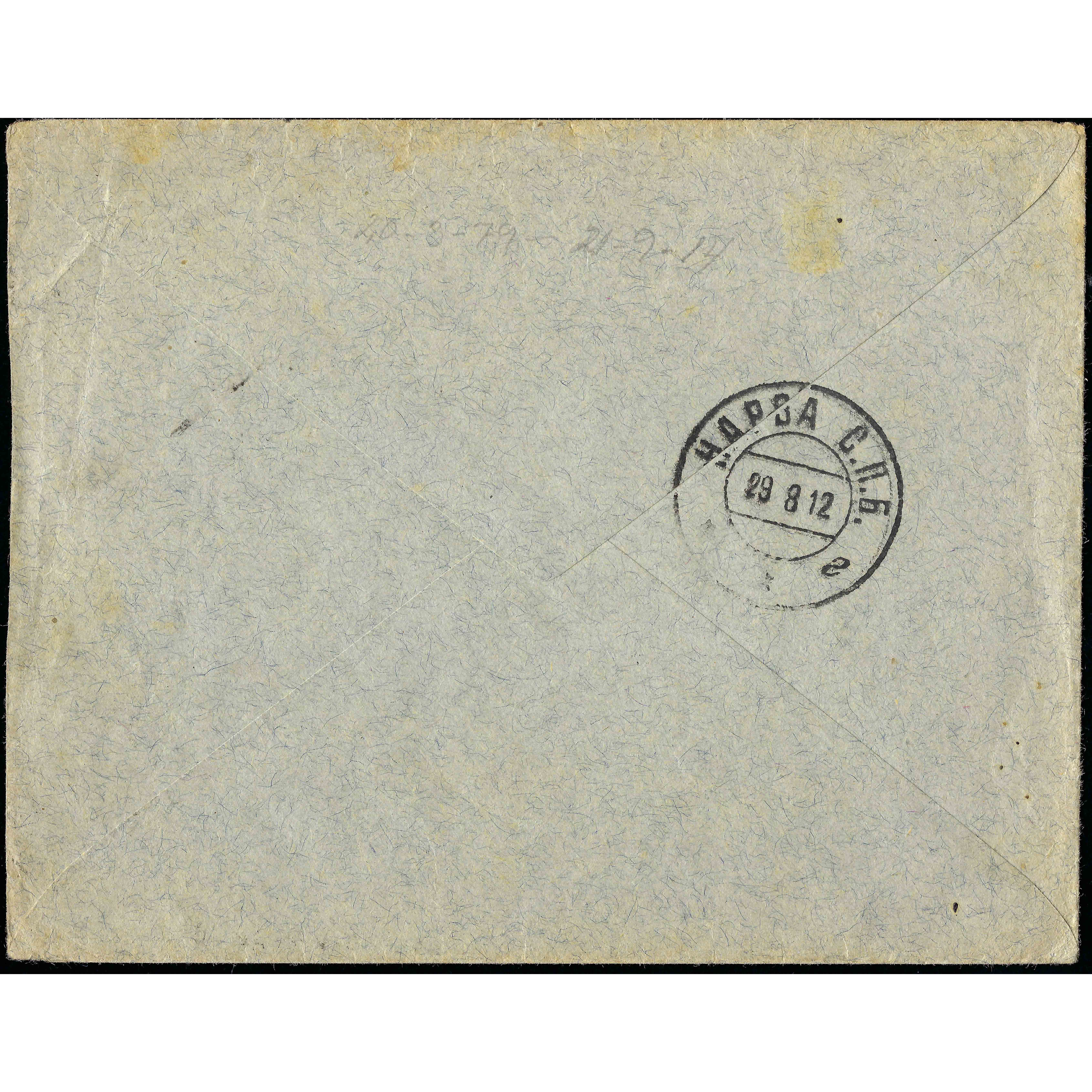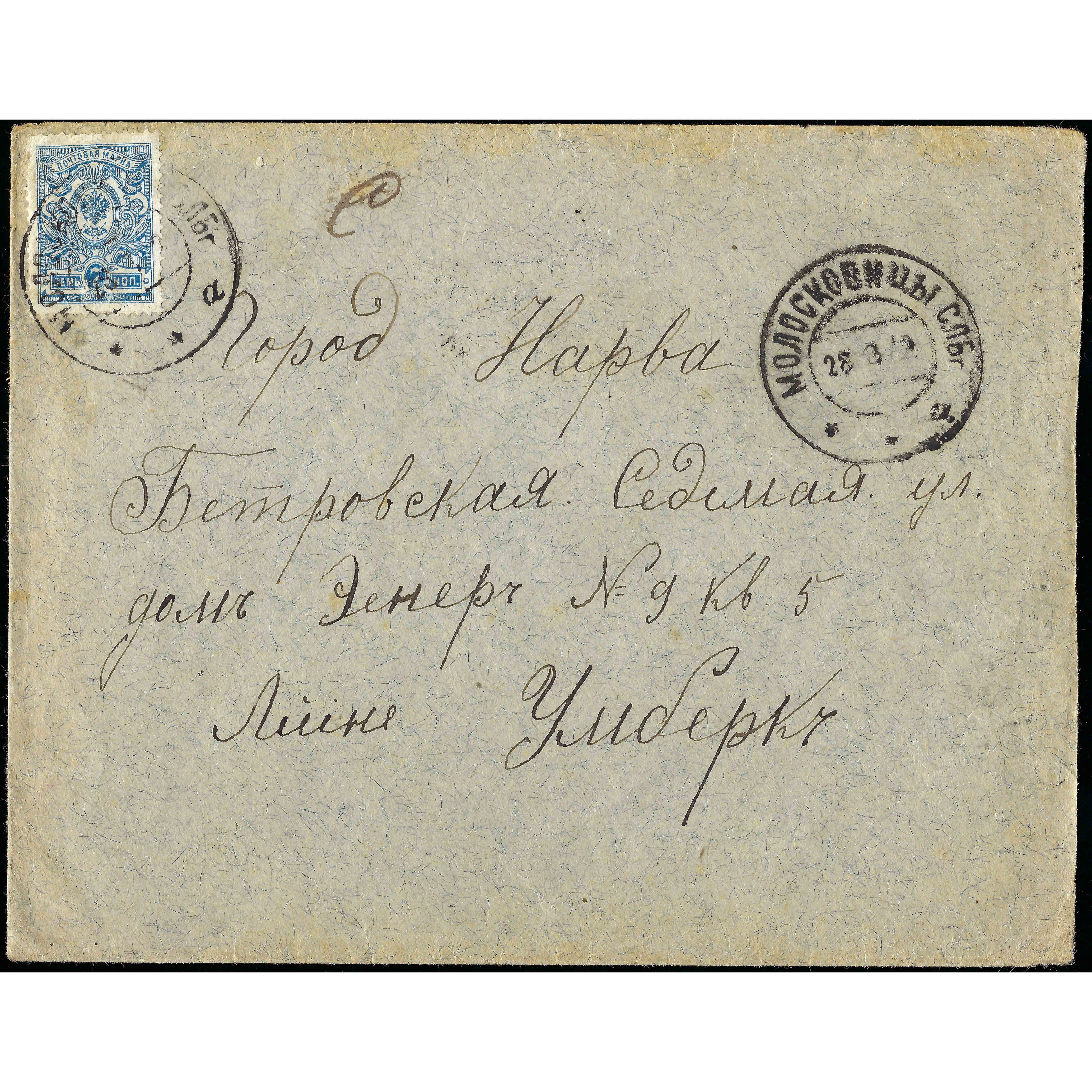 28.8.1912. Письмо отправлено из Молосковицы в Нарву, Эстония; на обратной стороне стоит штамп о получении от 29.8.1912. Тариф: 1-й вес. класс с 20.3.1879 по 21.9.1914 = 7 копеек