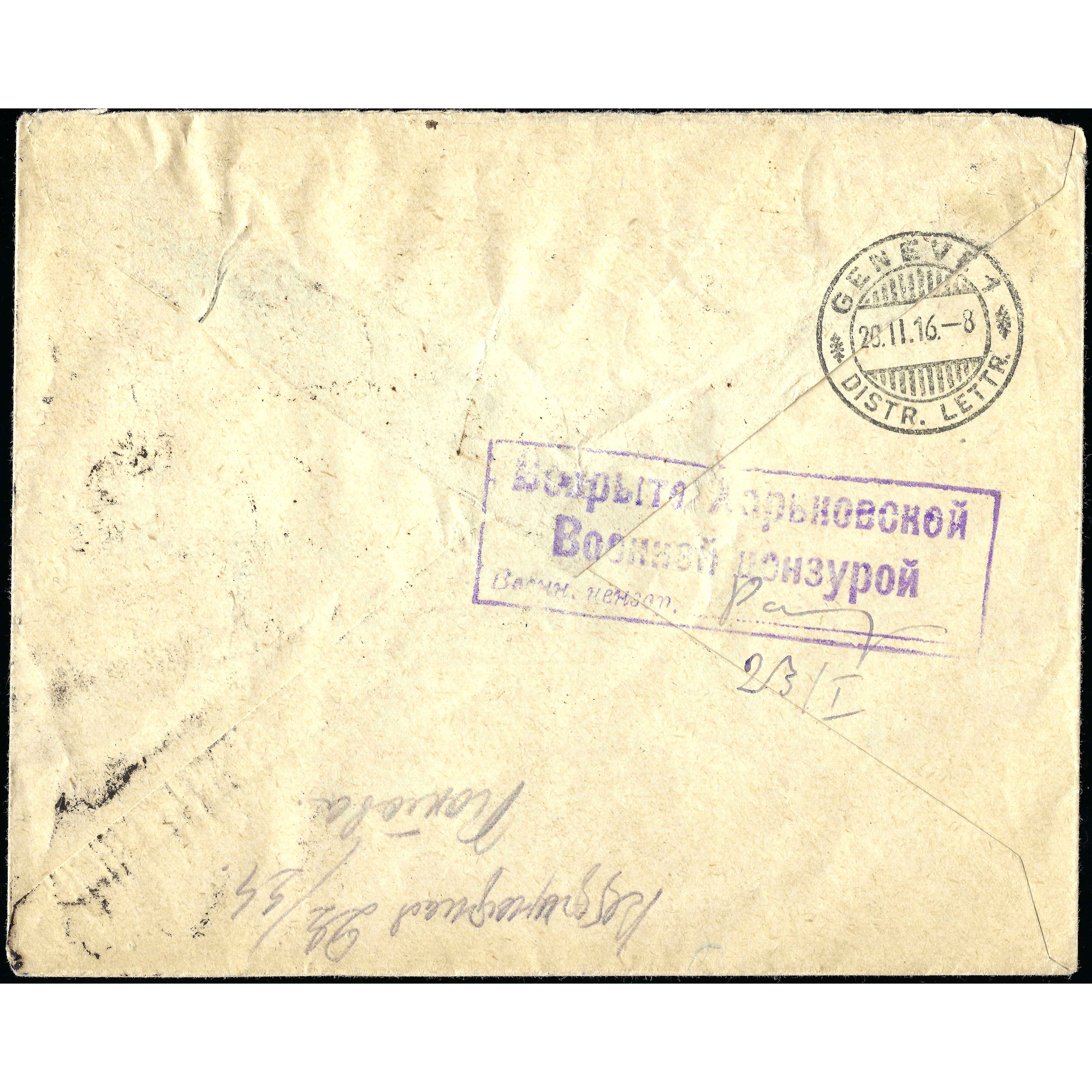 22.1.15. Заказное письмо из Харькова в Женеву. На обороте штампы цензуры, получено 29.2.16 (согласно григорианскому/юлианскому календарю). Адресат: В это время Красный Крест в Женеве занимался поиском военнопленных и передачей писем между разделенными войной семьями. Бюро корреспонденции обрабатывало тысячи запросов. Крупная надпись «Rouge Croix» красным карандашом была сделана почтовыми работниками, чтобы письмо быстрее попало в нужный распределительный центр.