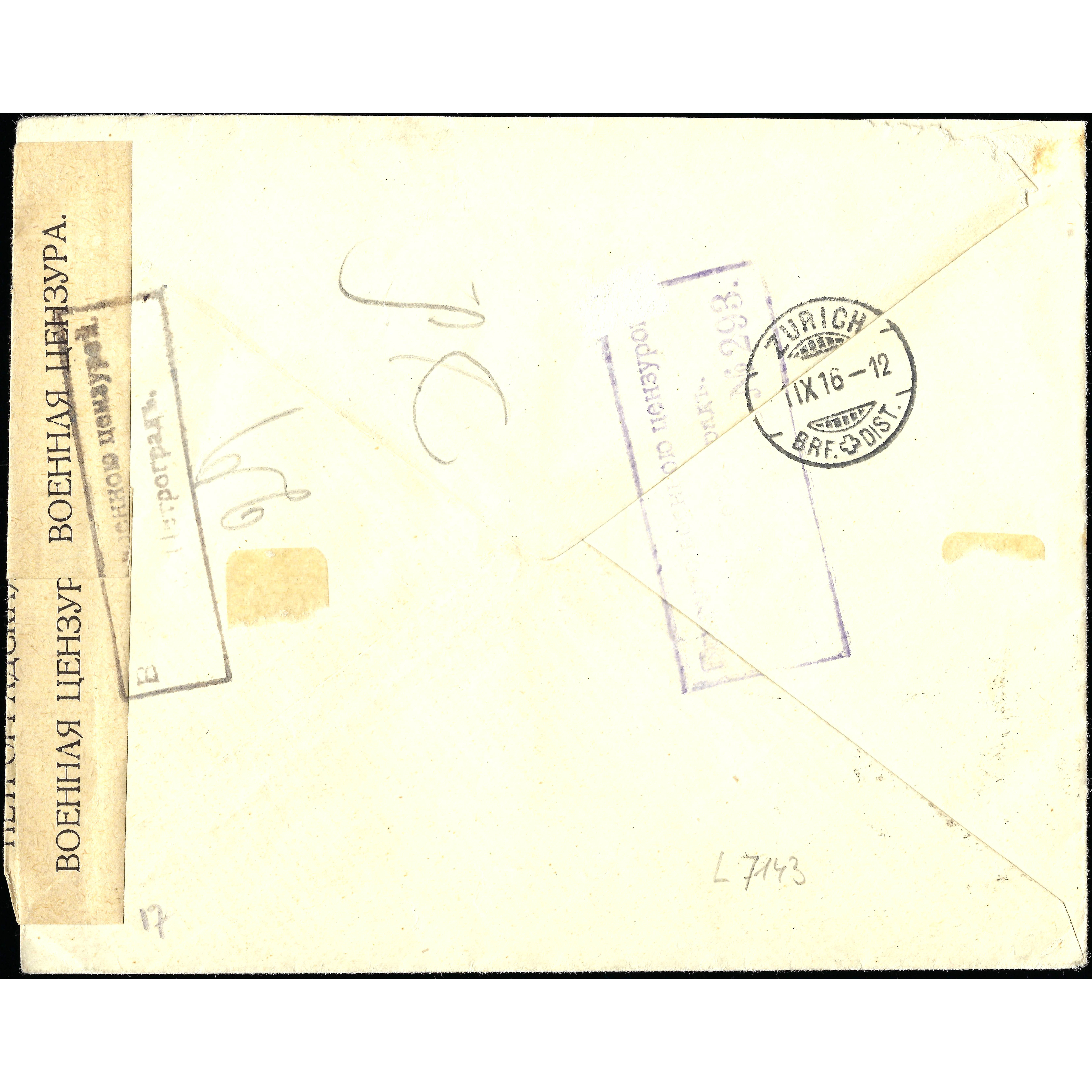 26.7.1916. Заказное цензурное письмо из Петрограда в Швейцарию, правильно франкировано и получено в Цюрихе 12.8.1916. Григорианский/Юлианский календарь.