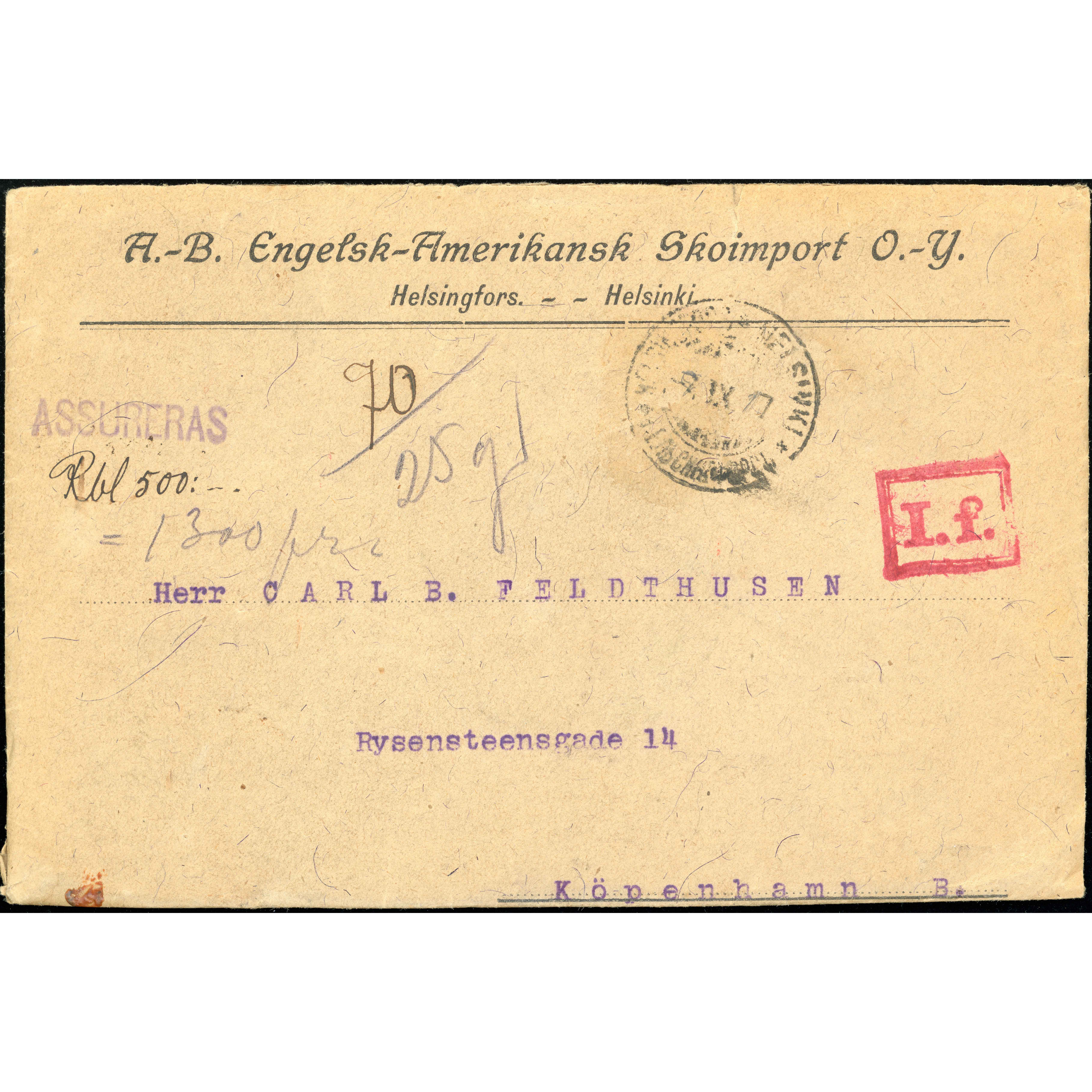 Тарифный период за границу: 1.9.1917 – 9.3.1918. 9.9.1917. Согласно лицевой стороне, это ценное письмо, отправленное из Гельсингфорса (Helsingfors) в Копенгаген. Вскрыто цензурой в Хельсинки и запечатано двумя коричневыми сургучными печатями. Красные печати свидетельствуют о том, что письмо отправлено обувной компанией из Хельсинки. Тариф для ценных писем в этот период составлял 50 копеек.
