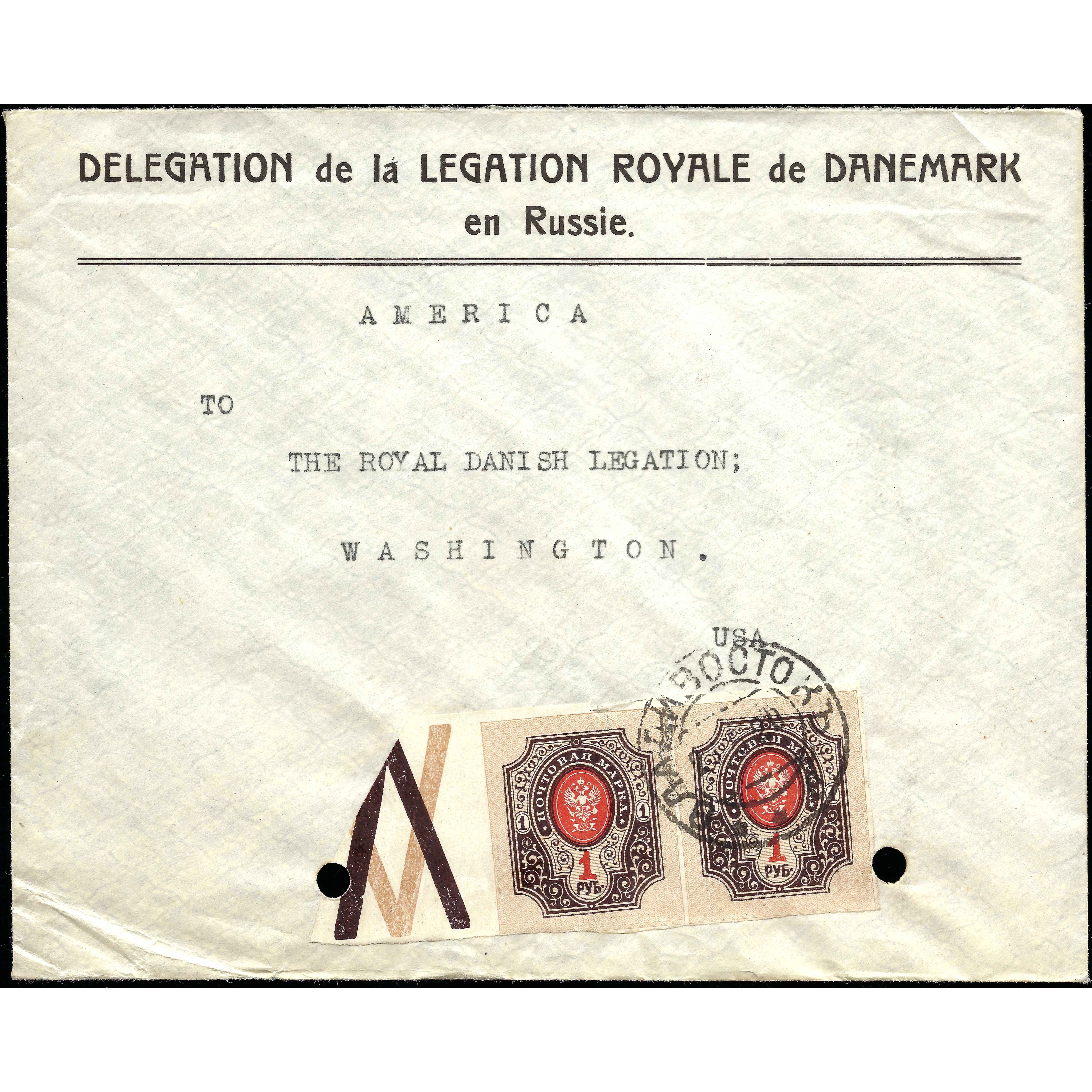 Письмо отправлено из Делегации Королевской миссии Дании в России, находящейся во Владивостоке, 2 мая 1920 года, в датскую миссию в Вашингтоне, США. Письмо франкировано марками номиналом 2х1 рубль из краевой части листа, о чем свидетельствует перечеркнутый знак "V". Тариф: стоимость пересылки за границу действовала с 1919 года по 6 июня 1920 года.