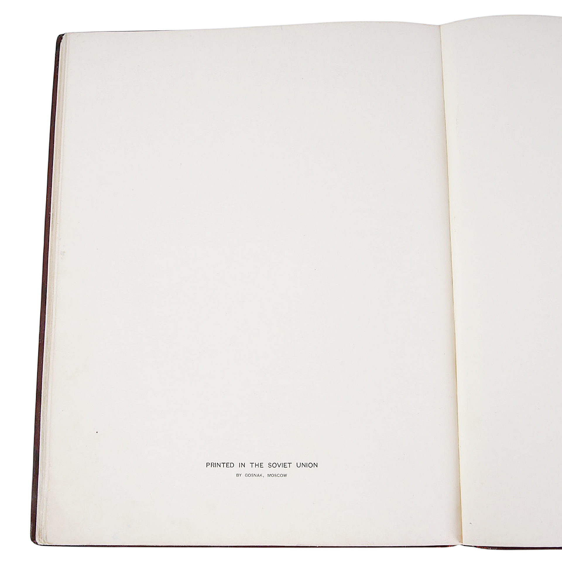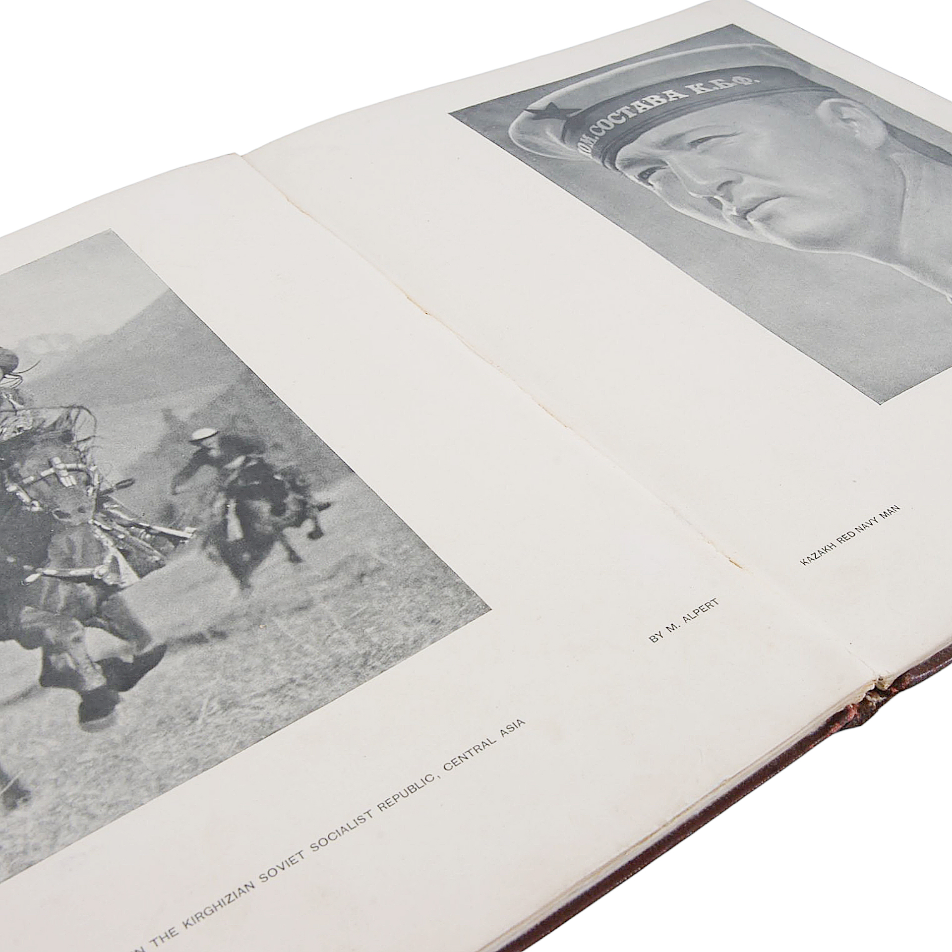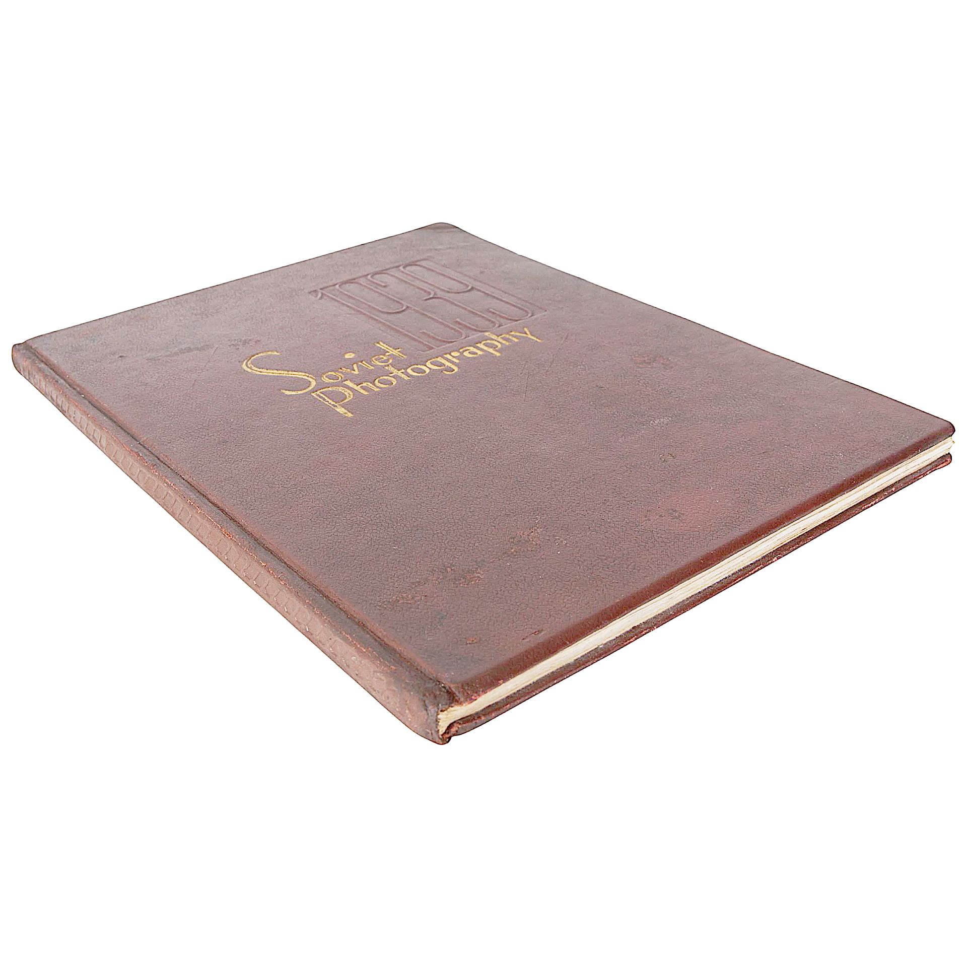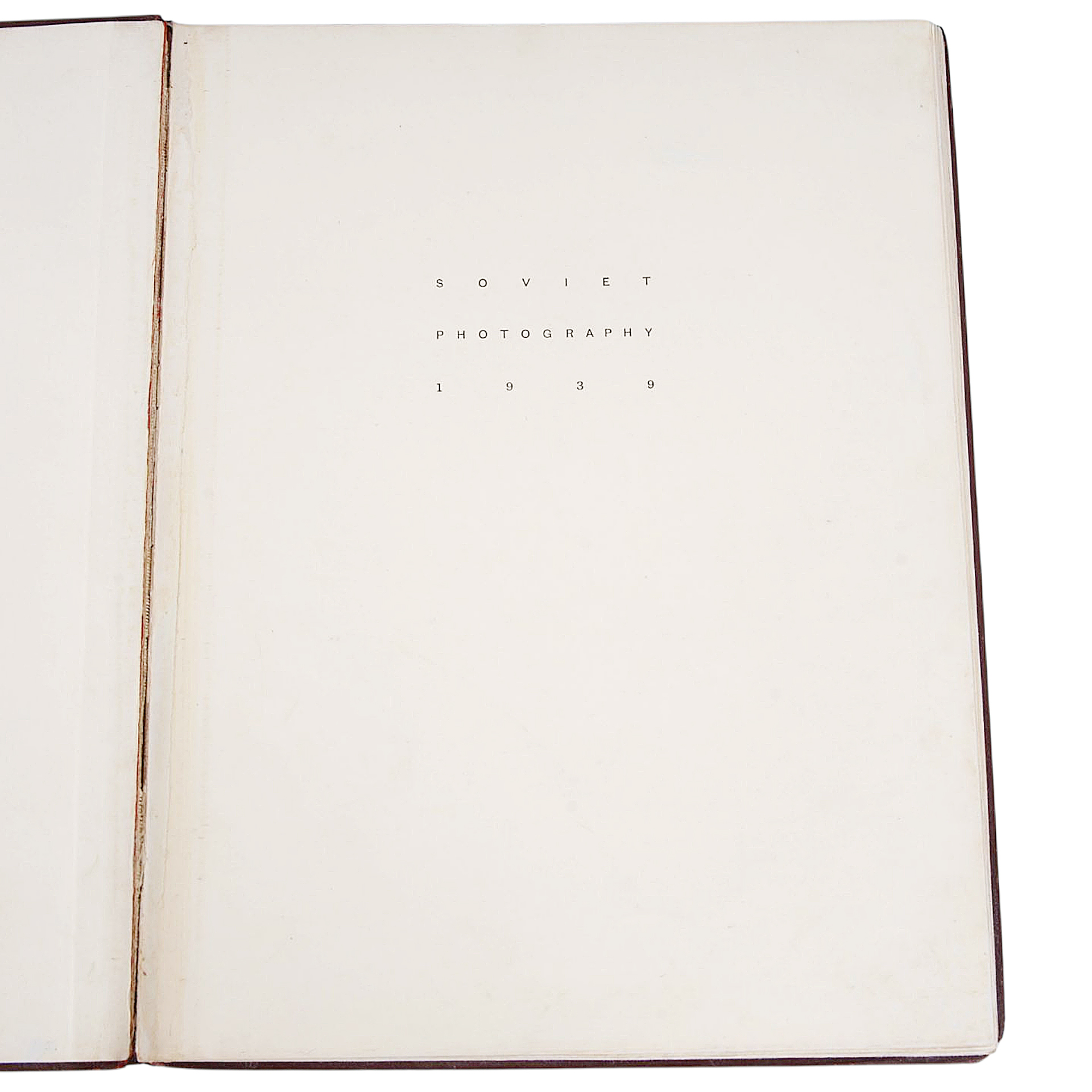 «Советская фотография 1939» — роскошный фотоальбом, изданный в Москве в 1939 году, демонстрирующий достижения советской фотографии накануне Второй мировой войны. Альбом выпущен Государственным издательством кинематографической литературы и включает 66 фоторабот ведущих мастеров того времени — от авангардных экспериментов Александра Родченко до портретов работы Макса Альперта, а также снимков Бориса Игнатовича, Георгия Зельмы, Моисея Наппельбаума и других авторов. Содержательно издание охватывает широкий спектр сюжетов: в нём представлены парадные портреты вождей (Ленина и Сталина) и видных деятелей культуры (Станиславского, Шолохова), масштабные сцены из жизни народа (например, первомайская демонстрация на Красной площади), кадры с героических полярных экспедиций и портреты лётчиков-героев, таких как Валерий Чкалов. Цель публикации — через эти изображения воплотить образ «нового советского человека» – смелого, самоотверженного, патриотичного, устремлённого к победе – и создать идеализированную картину прогресса и единства страны. Оформление книги не менее впечатляет, чем её содержание: твёрдый переплёт бордового цвета (ледерин) с золотым тиснёным названием и декоративным корешком, плотная кремовая бумага и чёткое воспроизведение фотографий методом высокой печати придают альбому поистине парадный, представительский вид. Примечательно, что введение в альбоме напечатано на английском языке — издание было ориентировано на зарубежную аудиторию и, возможно, создавалось как сувенир для Нью-Йоркской Всемирной выставки 1939 года. В представленном экземпляре отсутствует титульная страница и четыре оригинальные фотографии. Несмотря на это, издание остаётся редким коллекционным раритетом, ценимым за уникальный исторический контекст и визуальную силу советской пропаганды предвоенных лет.
