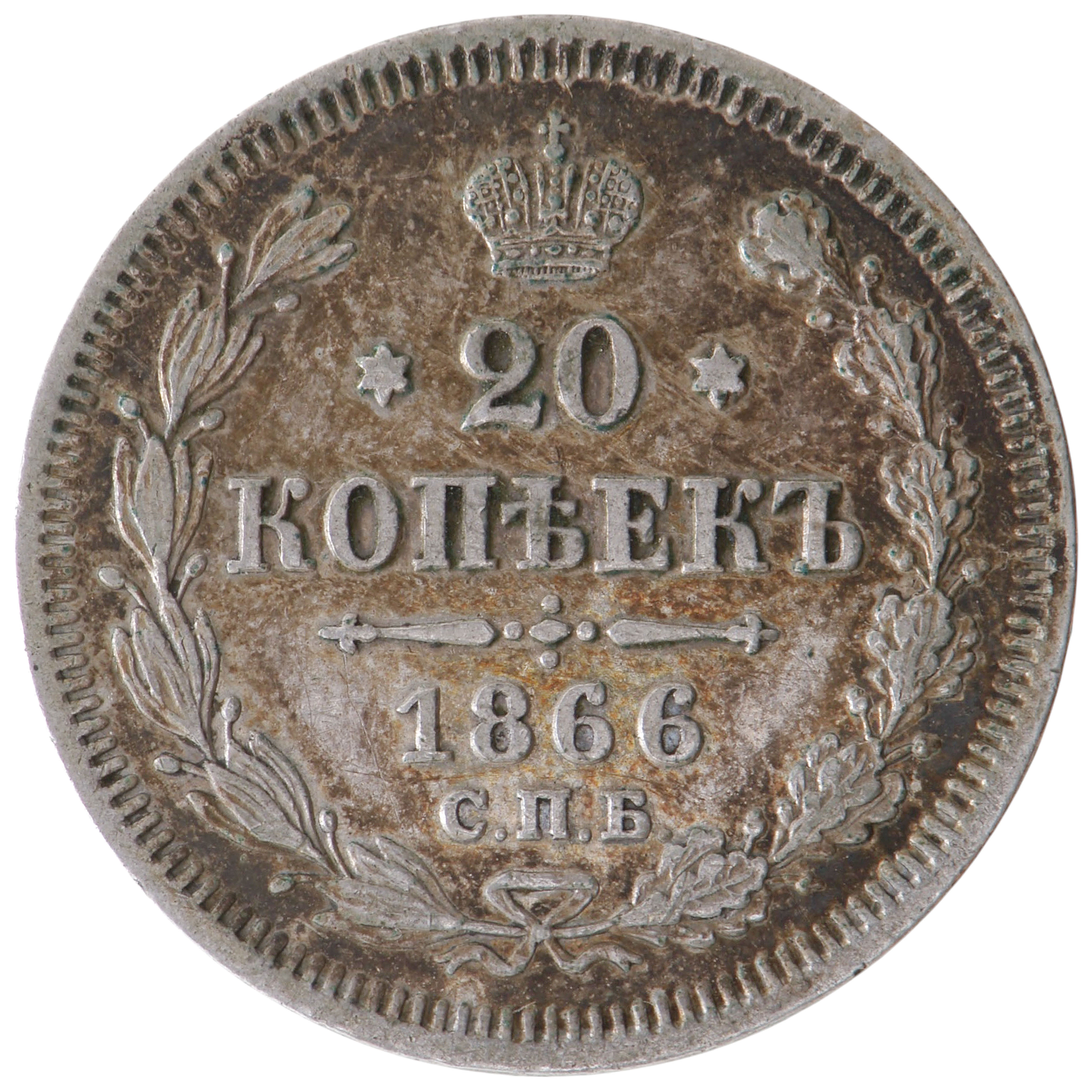 20 Копеек 1866 года (СПБ НI), Россия (AU), KM Y# 22.2