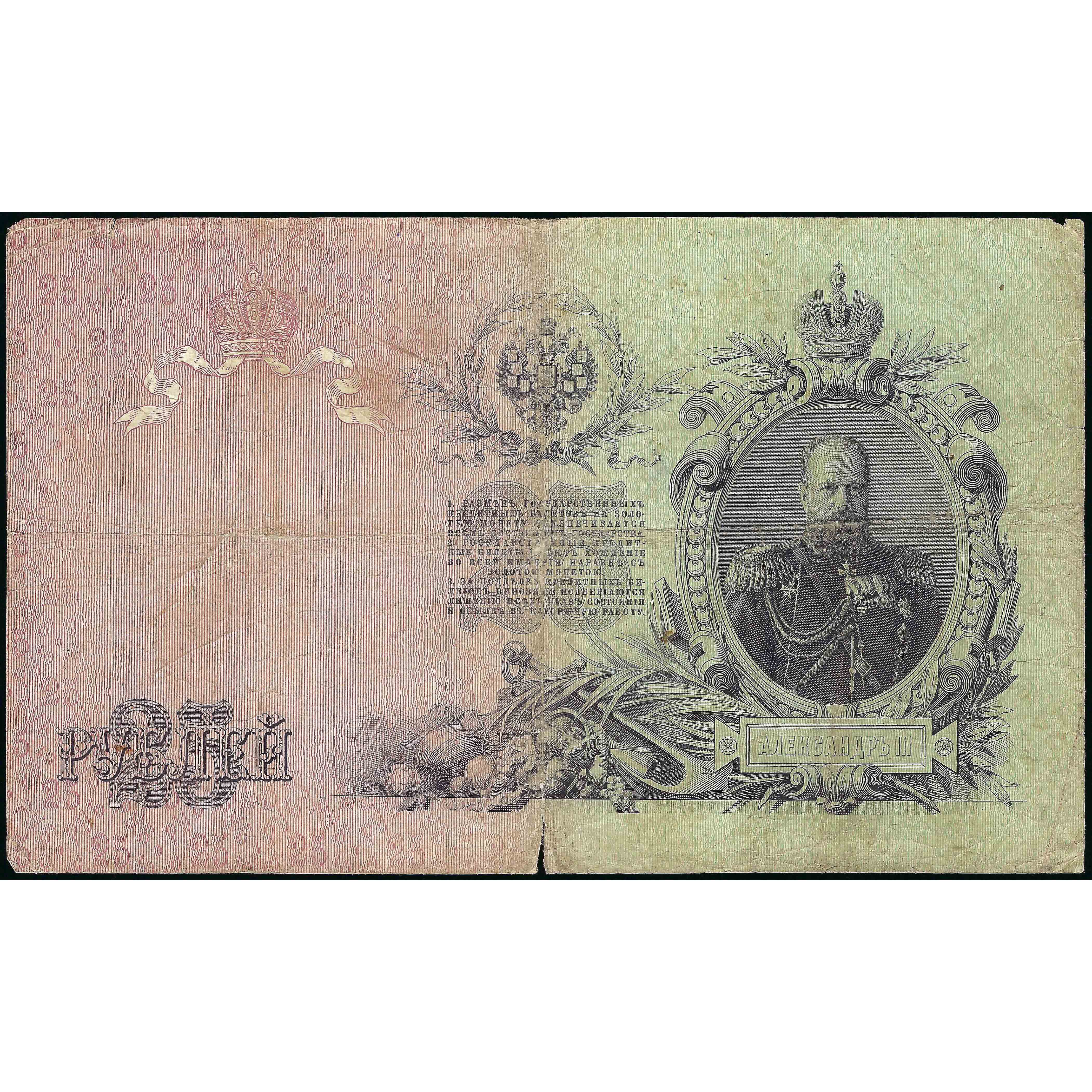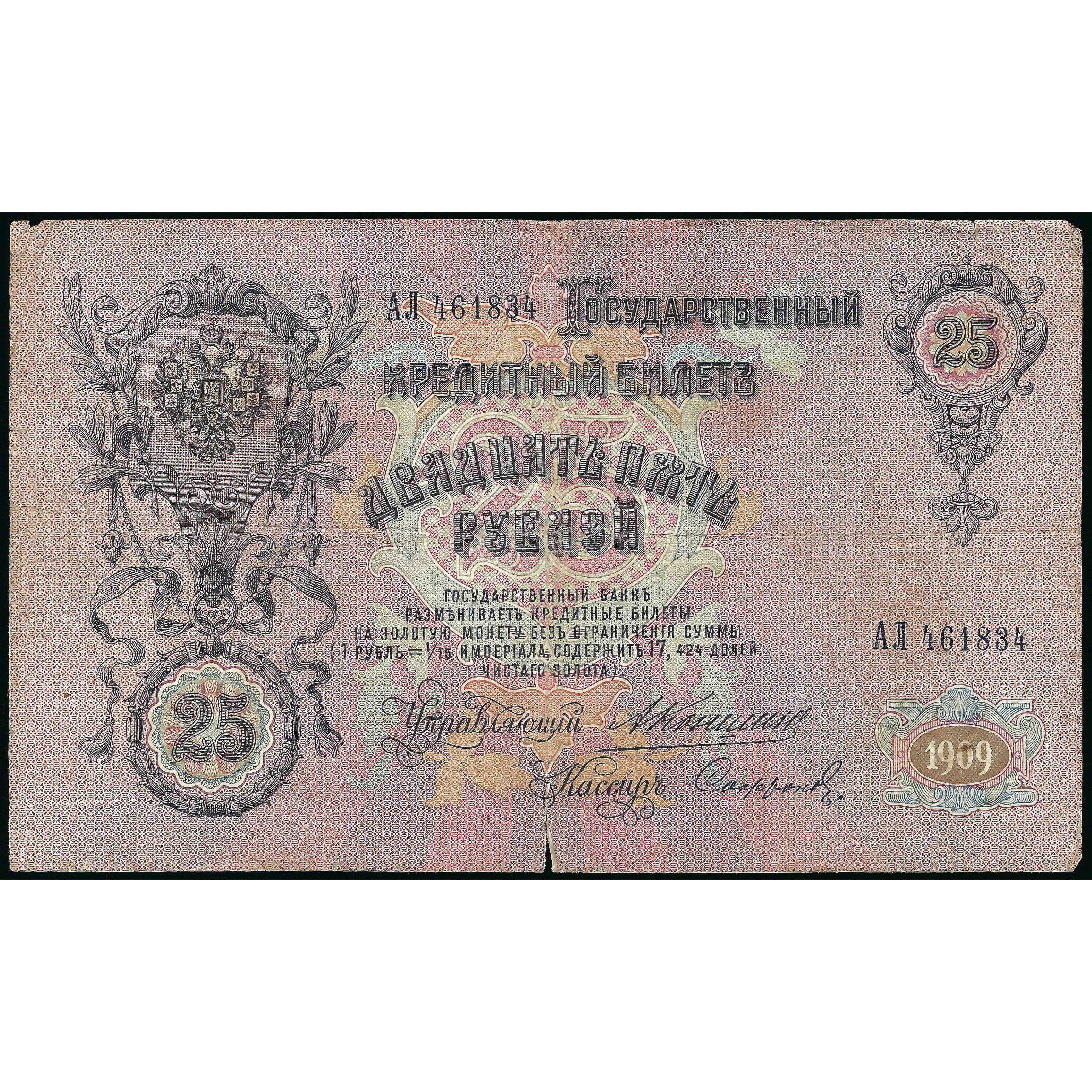 25 рублей, Россия, 1909 г. (1910 - 1914), подписи А. Коншин / Софронов (VG), Pick 12a