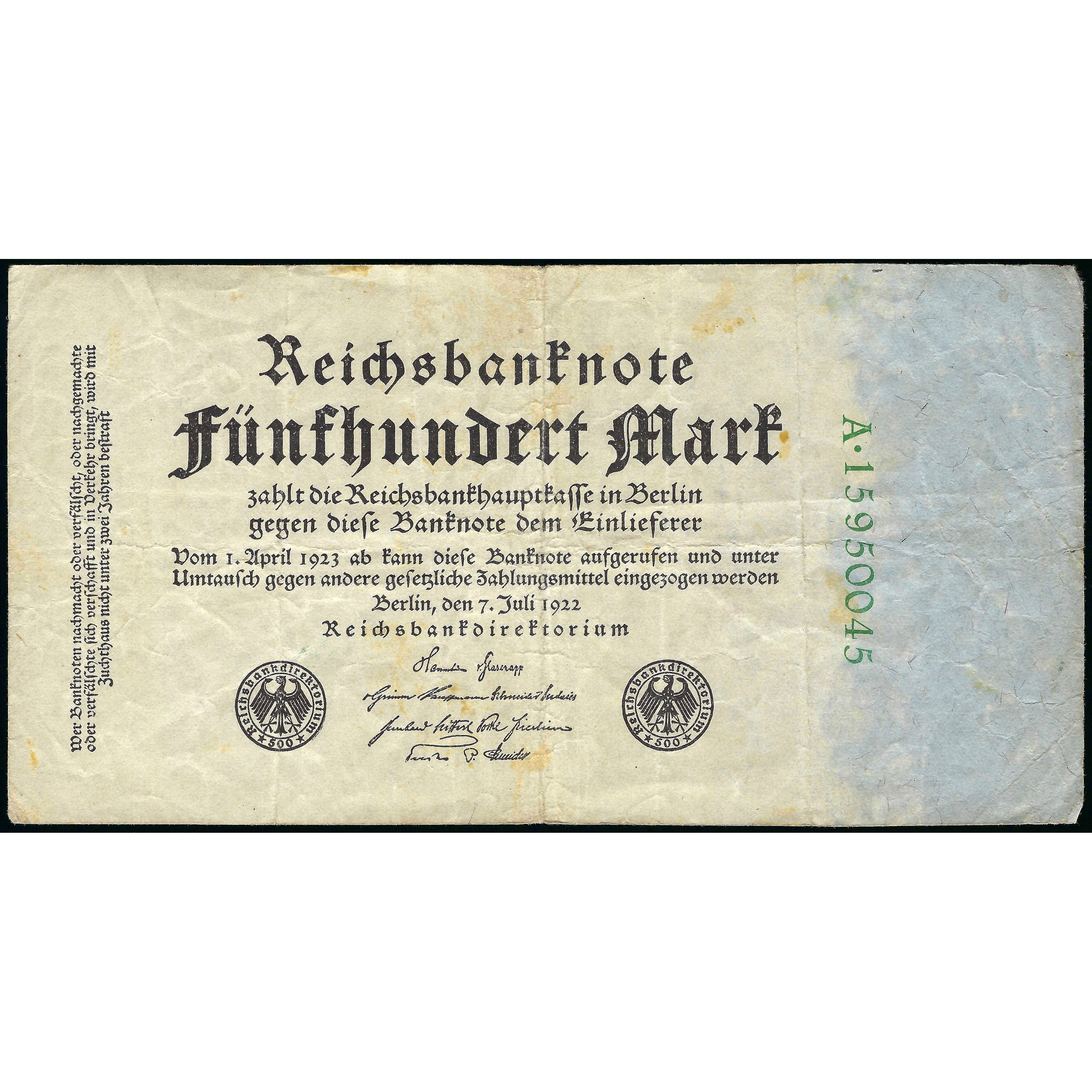 500 Марок, Германия, 1922 (F), 8-значный серийный номер, Pick 74c