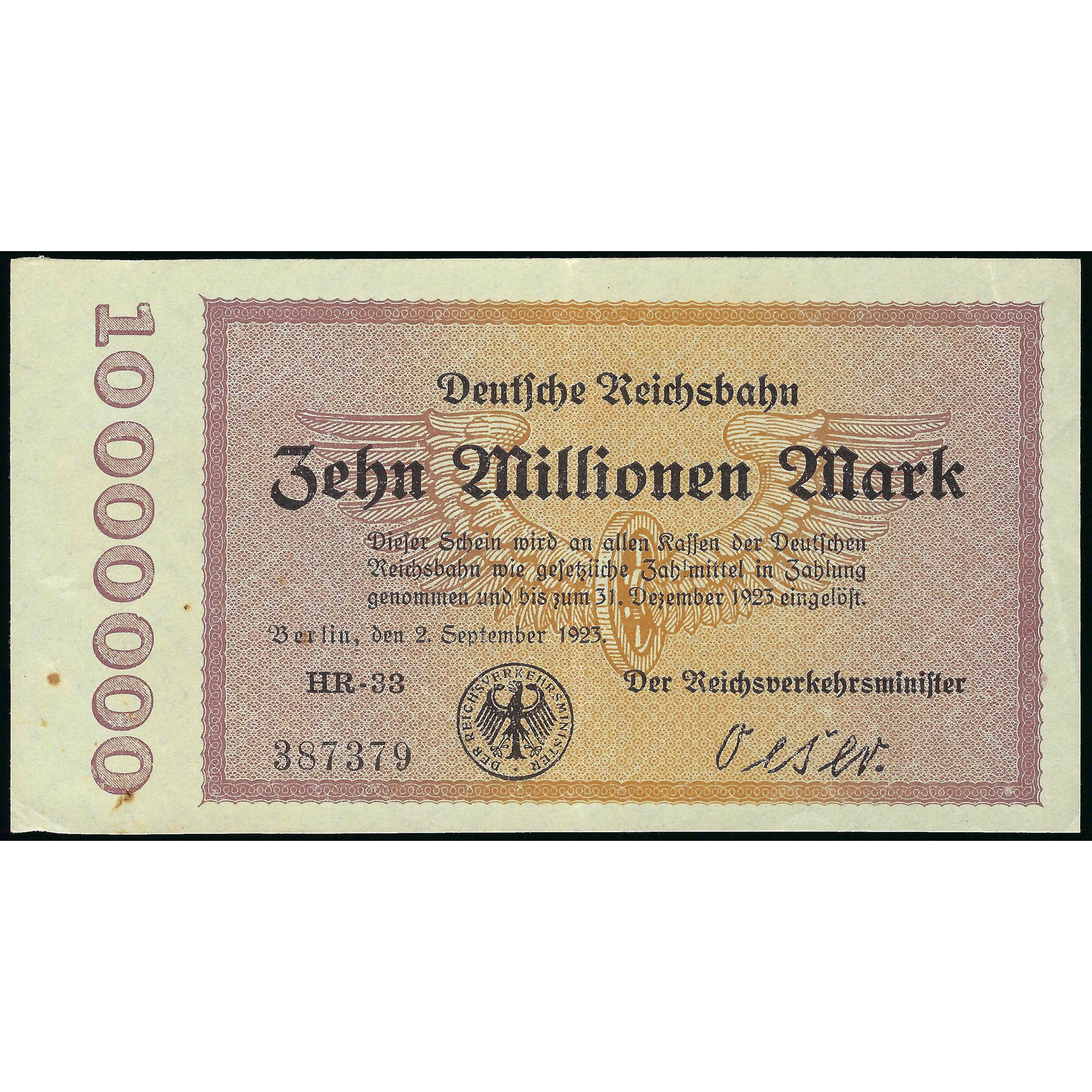 Нотгельд, 10 Миллионов Марок, Германия – Берлин, Германские железные дороги, 1923 (XF), Pick S1014
