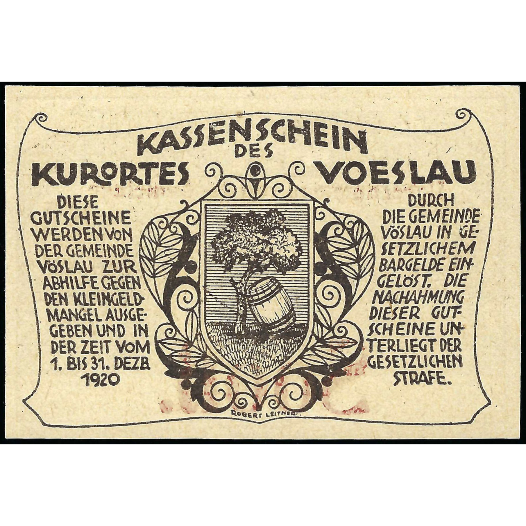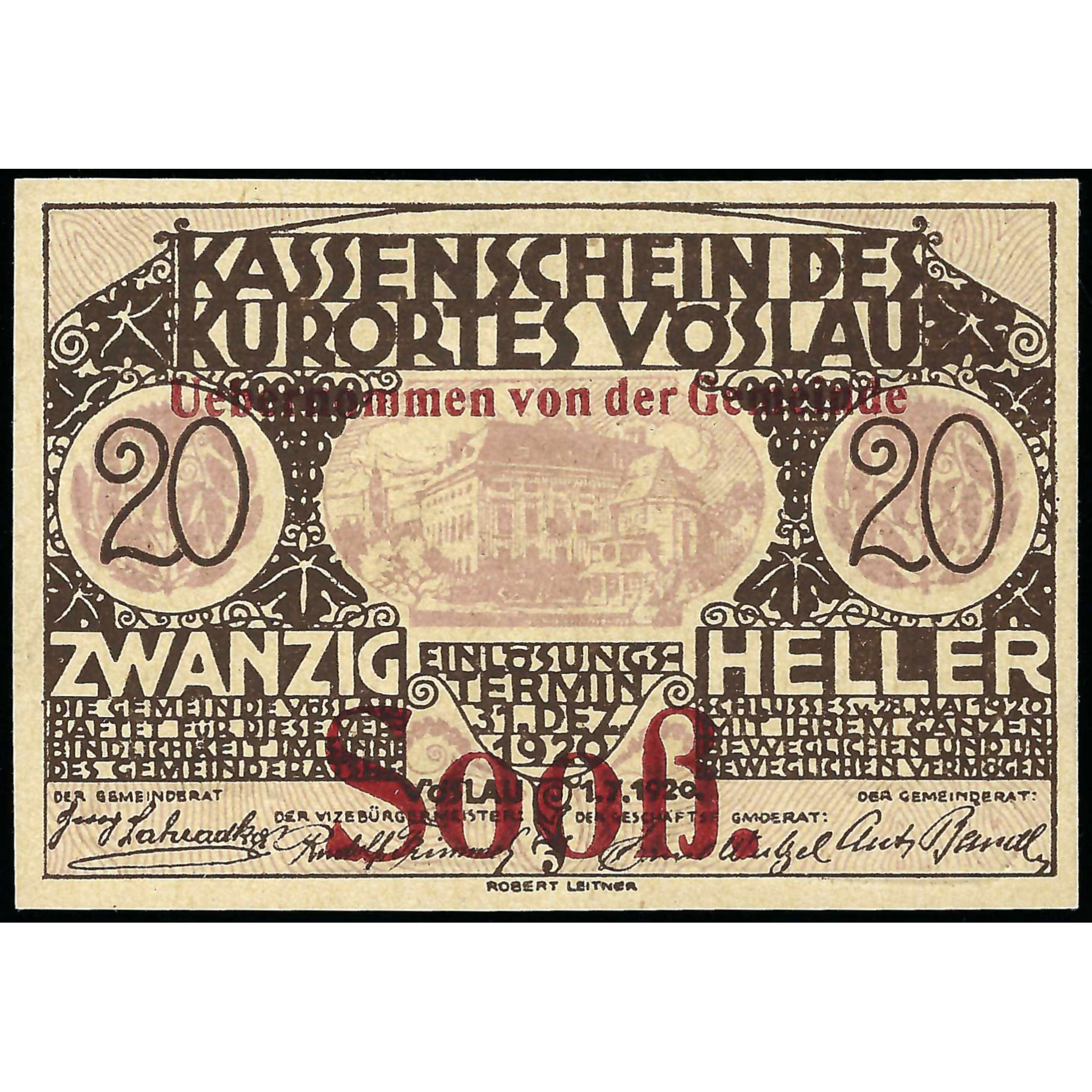 Нотгельд, 20 Геллеров, Австрия - Курортный Город Фёслaу, 1920 г. (UNC)