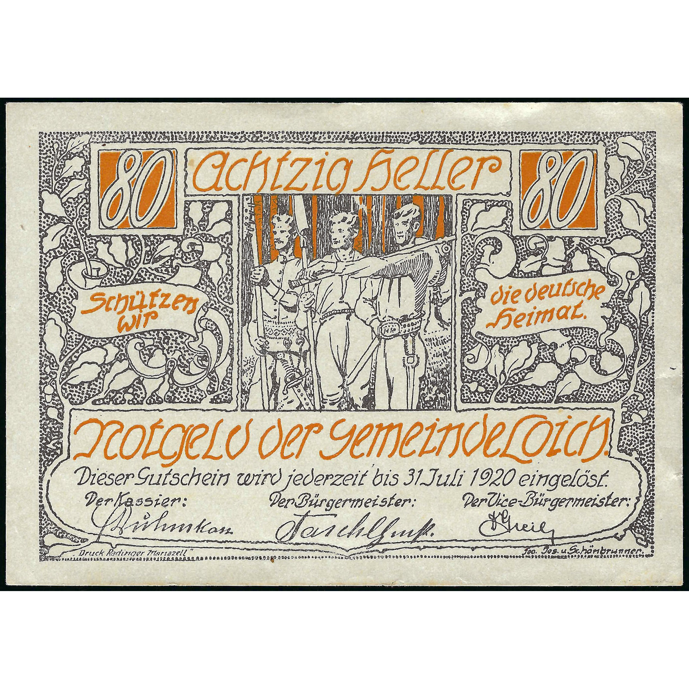 Нотгельд, 80 Геллеров, Австрия - Муниципалитет Лойх, 1920 г. (XF)