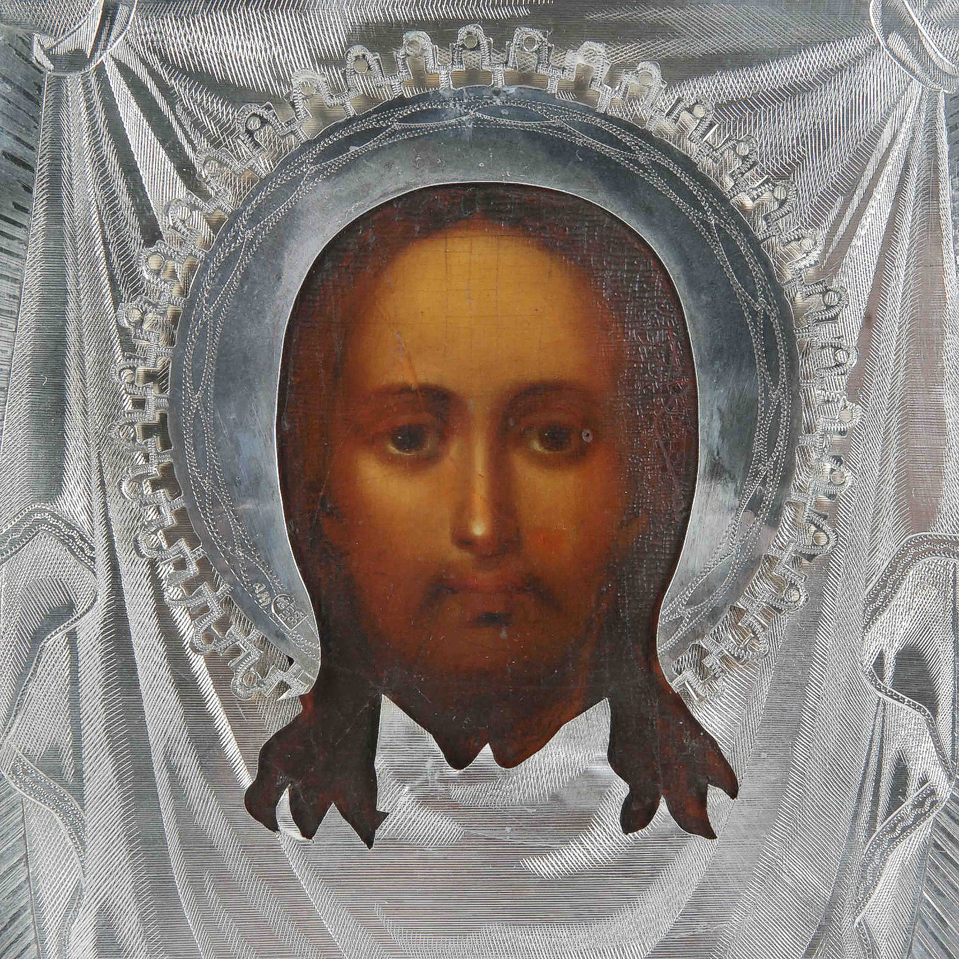 Лик Спасителя здесь очень выразительный, с большими глазами, смотрящими куда-то вбок, с тонко очерченными изогнутыми бровями, длинными волосами, спадающими на плечи двумя локонами с каждой стороны, с раздвоенной на конце небольшой бородой.