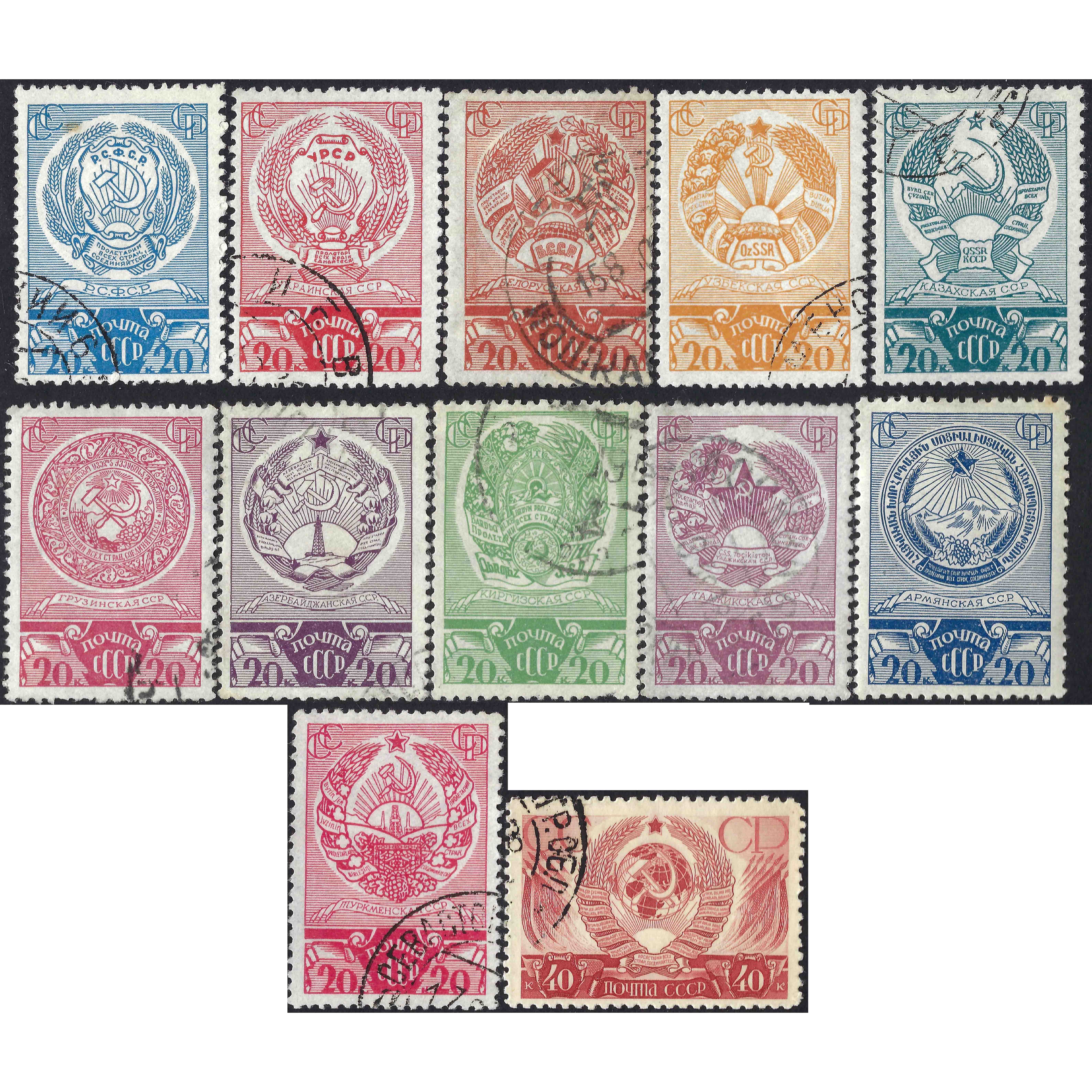 1937, USSR, 20k-40k, Solovyov #568-#578, Typographed, UnWmk, P12.5, USSR coats of arms